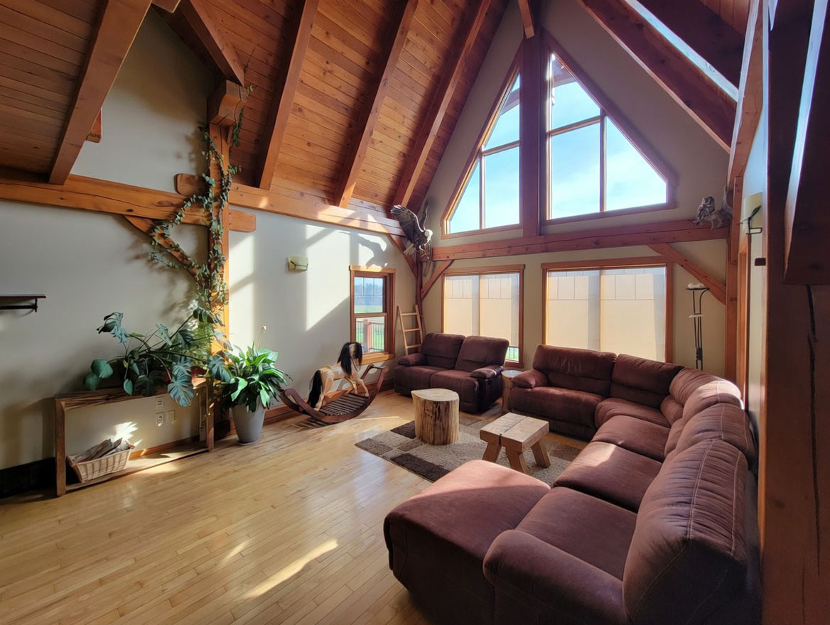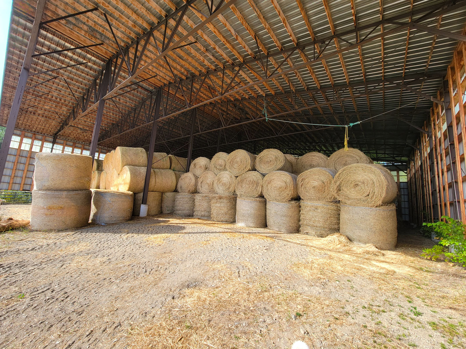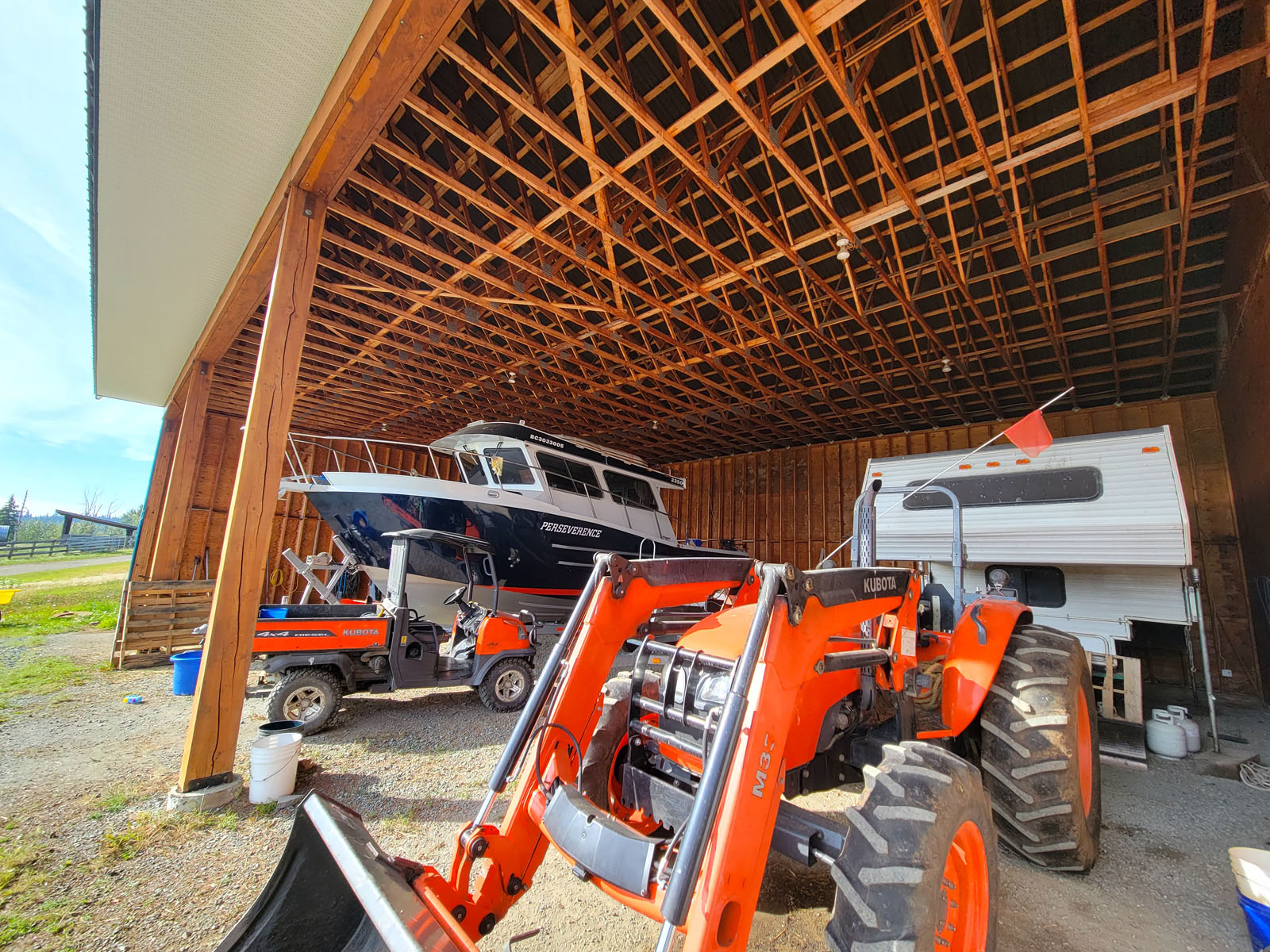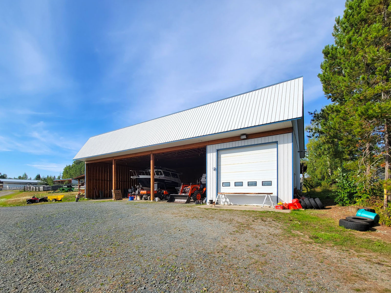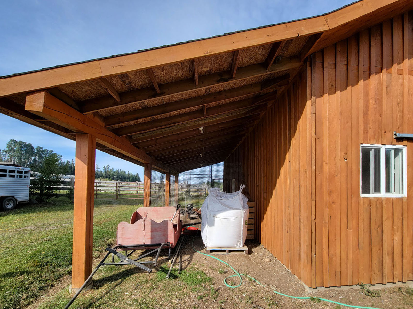 The agricultural outbuildings are extensive and purpose-built. A 936 square foot horse barn includes stalls, tack rooms and chicken pens with two lean-to attachments handles day-to-day livestock needs. A 3,200 square foot equipment building with concrete foundation and incorporates an enclosed and heated 20 by 40 ft shop with a concrete floor and floor drain, ideal for equipment maintenance and repairs. A 2,640 square foot five-bay pole shelter with concrete slab provides dedicated animal housing. A commanding 7,200 square foot steel hay storage structure with 21-foot clearance ensures the feed supply is well protected. Five additional lean-to outbuildings round out the support infrastructure.