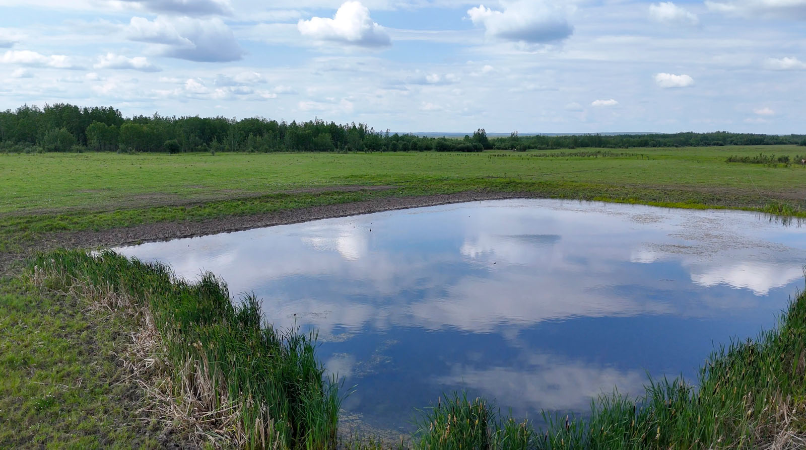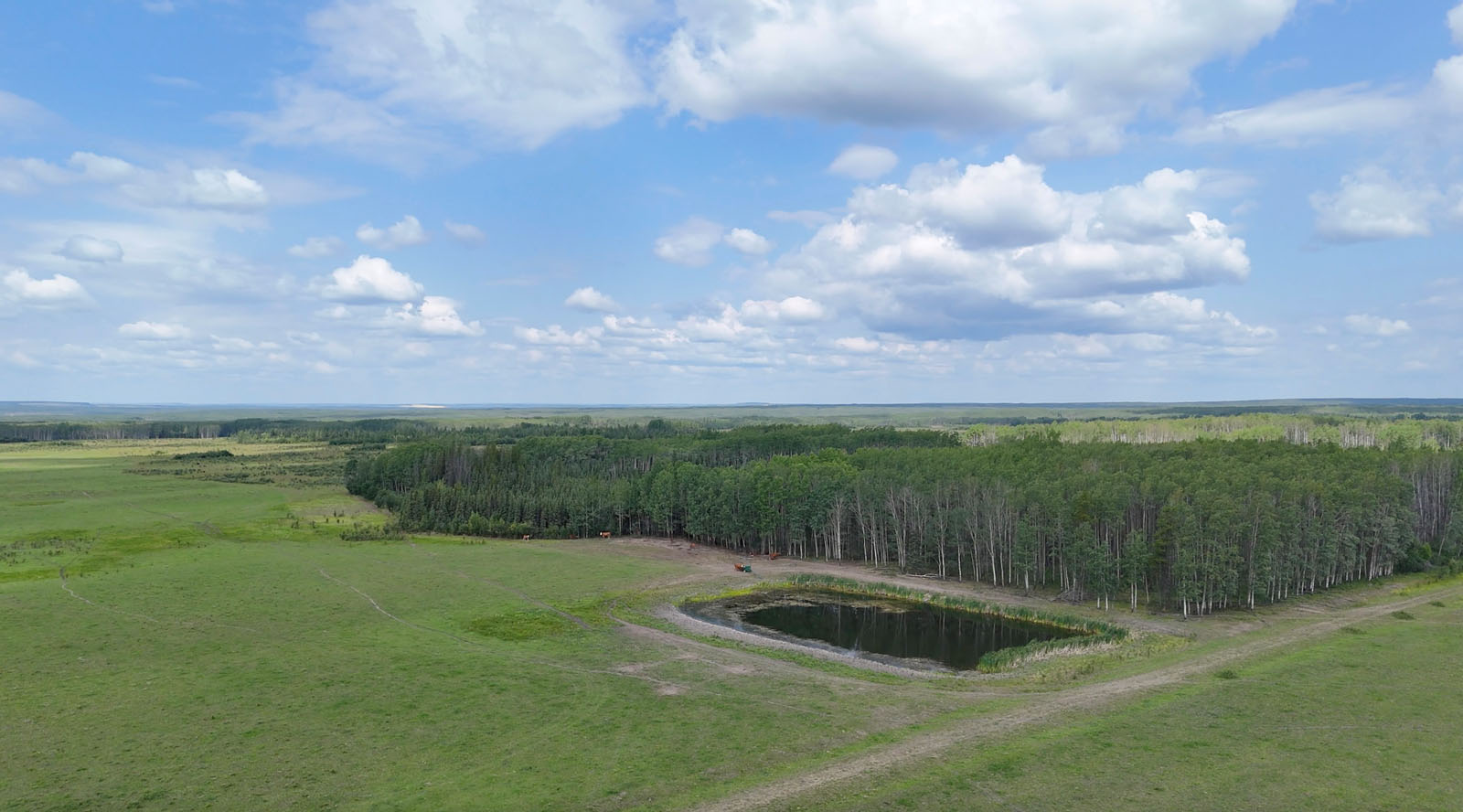 Natural shelter belts are formed by stands of aspen, white spruce, and willow, offering critical protection for livestock and contributing to ecological diversity across the landscape. These wooded areas support wildlife habitat, enhance moisture retention, and create windbreaks that reduce erosion and provide microclimates for forage growth. Low-lying areas also support riparian vegetation such as sedges, cattails, and shrubs around seasonal ponds and dugouts.