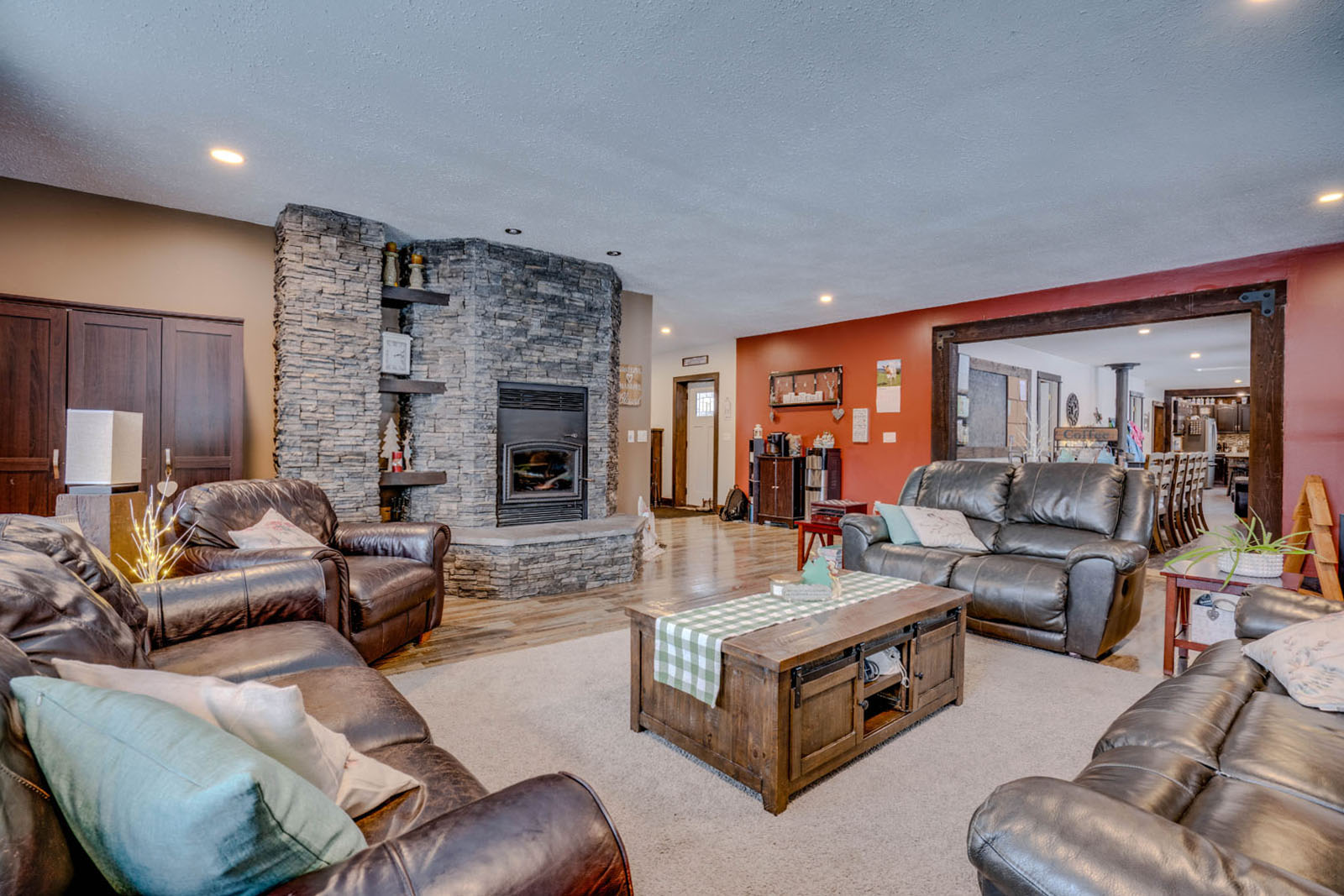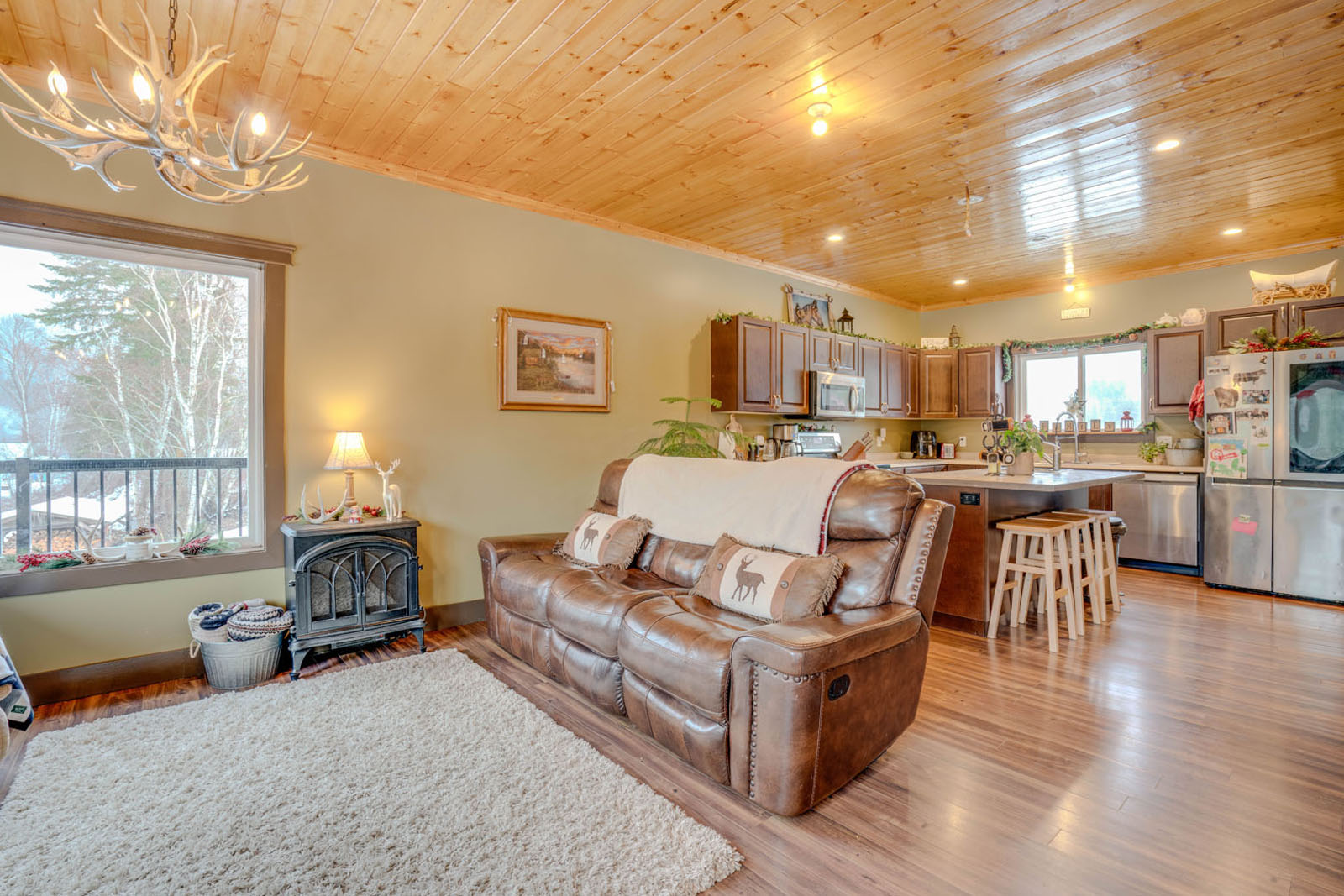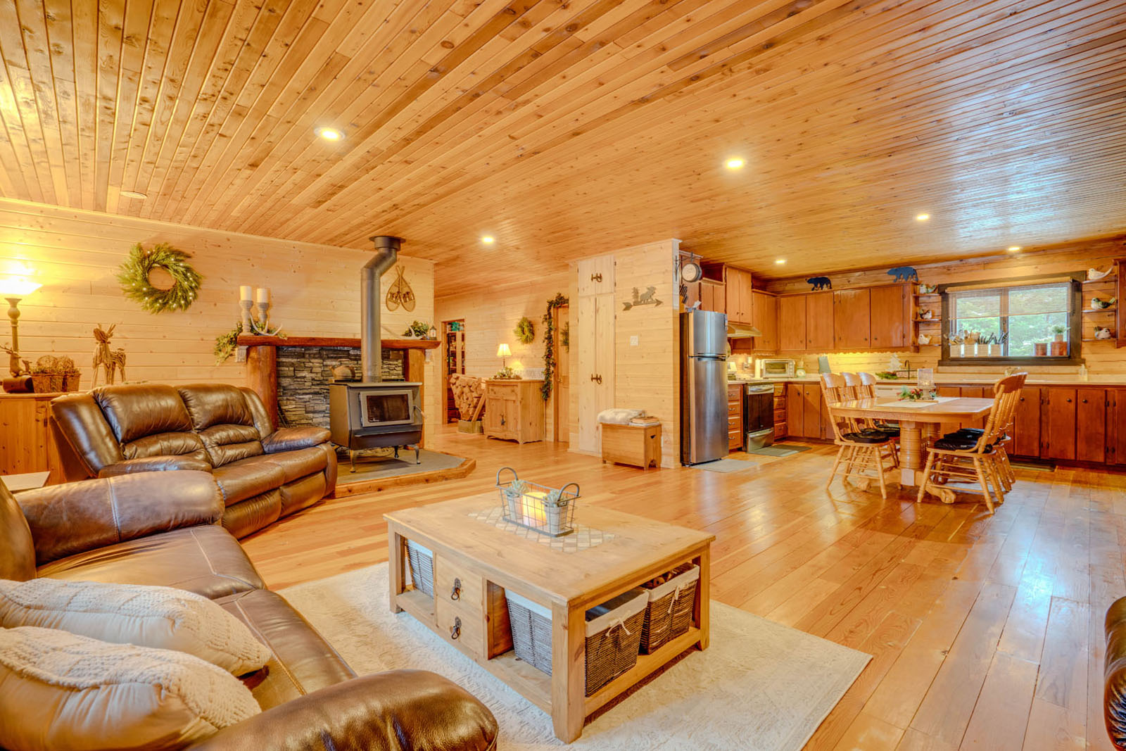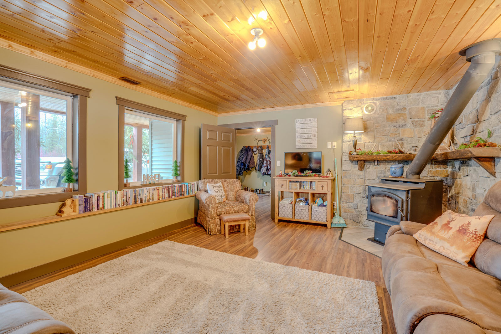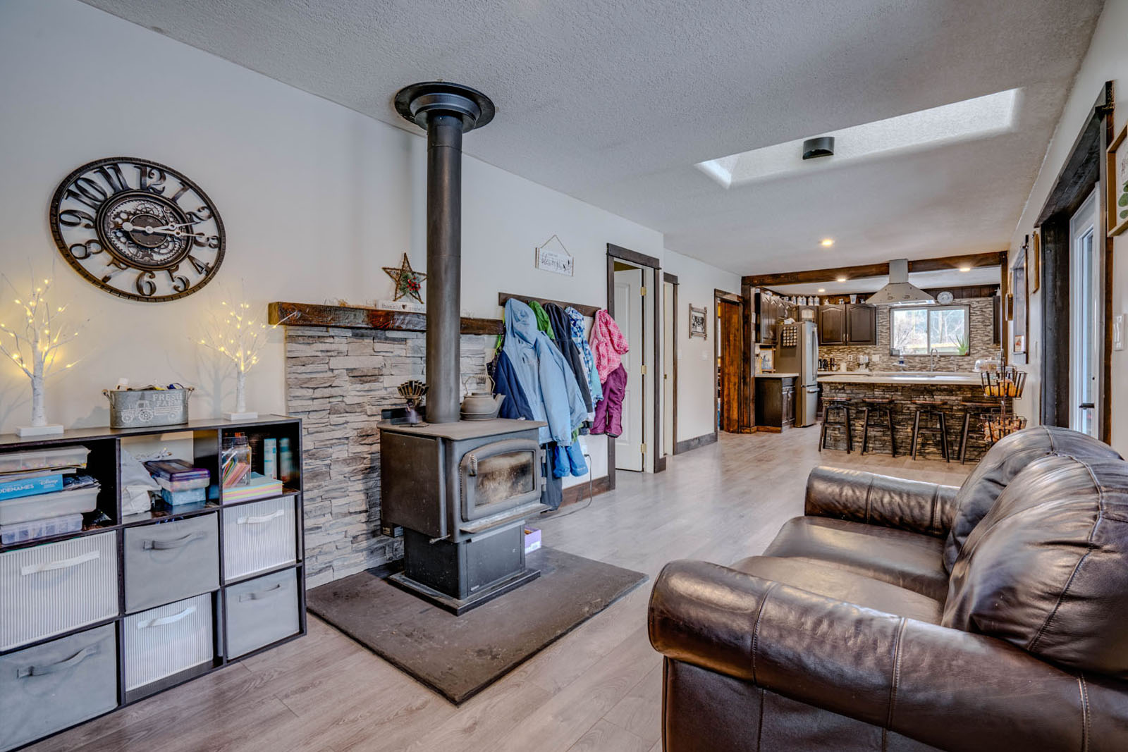 To the right, the family/living room features a freestanding wood stove providing efficient heating. The stove is enhanced by an extensive feature stone wall, a tile base, and a solid live edge wood mantel. With ample room, this area is well-suited for entertainment, recreation, or relaxation.