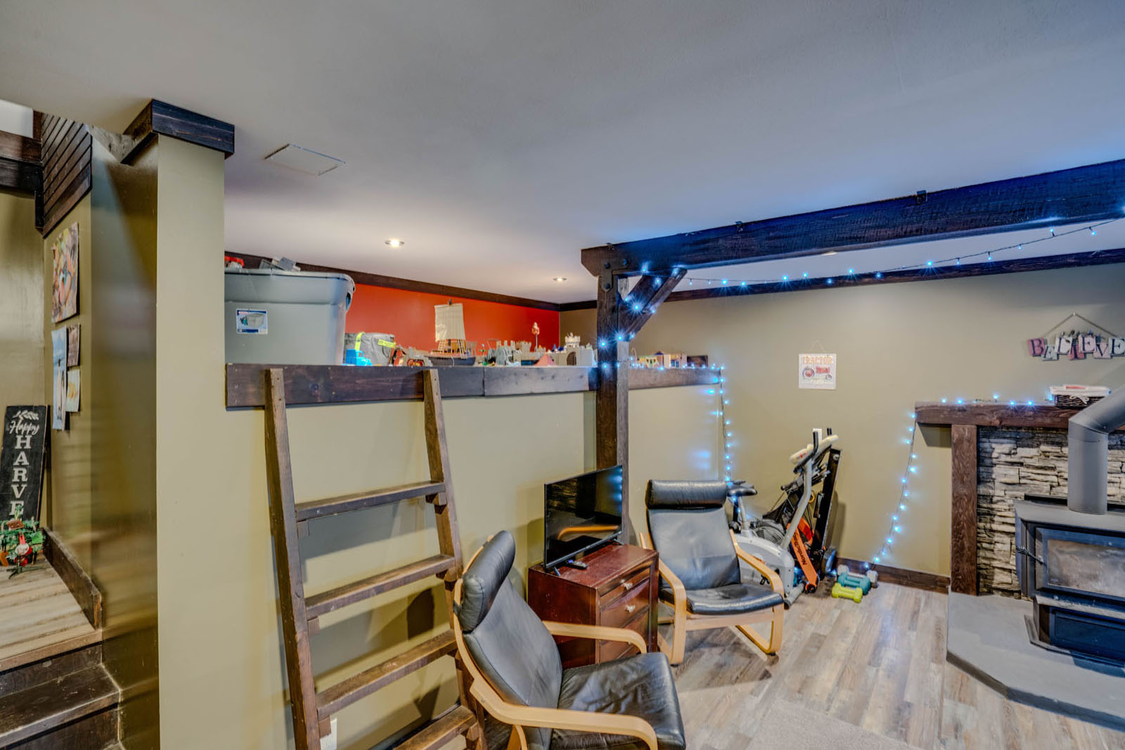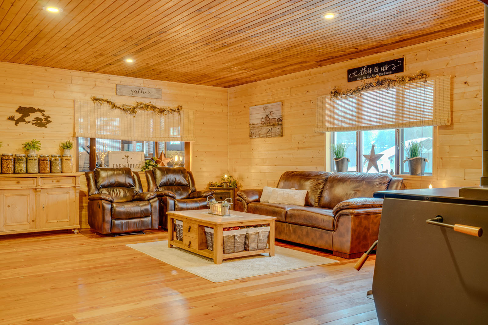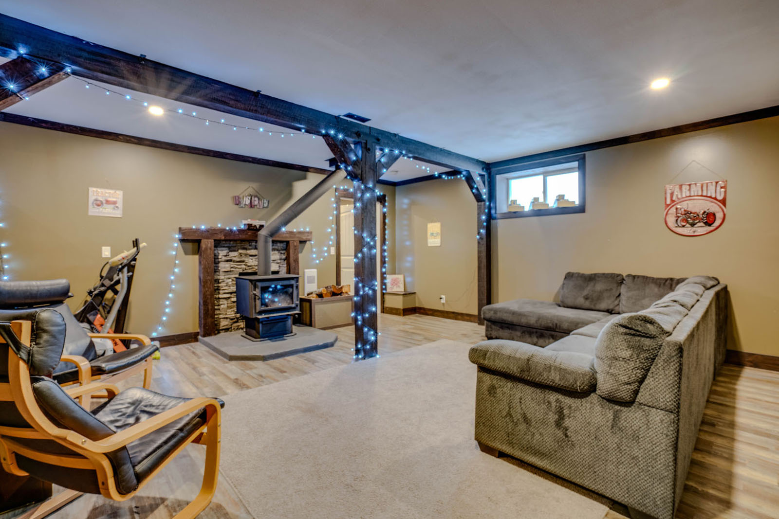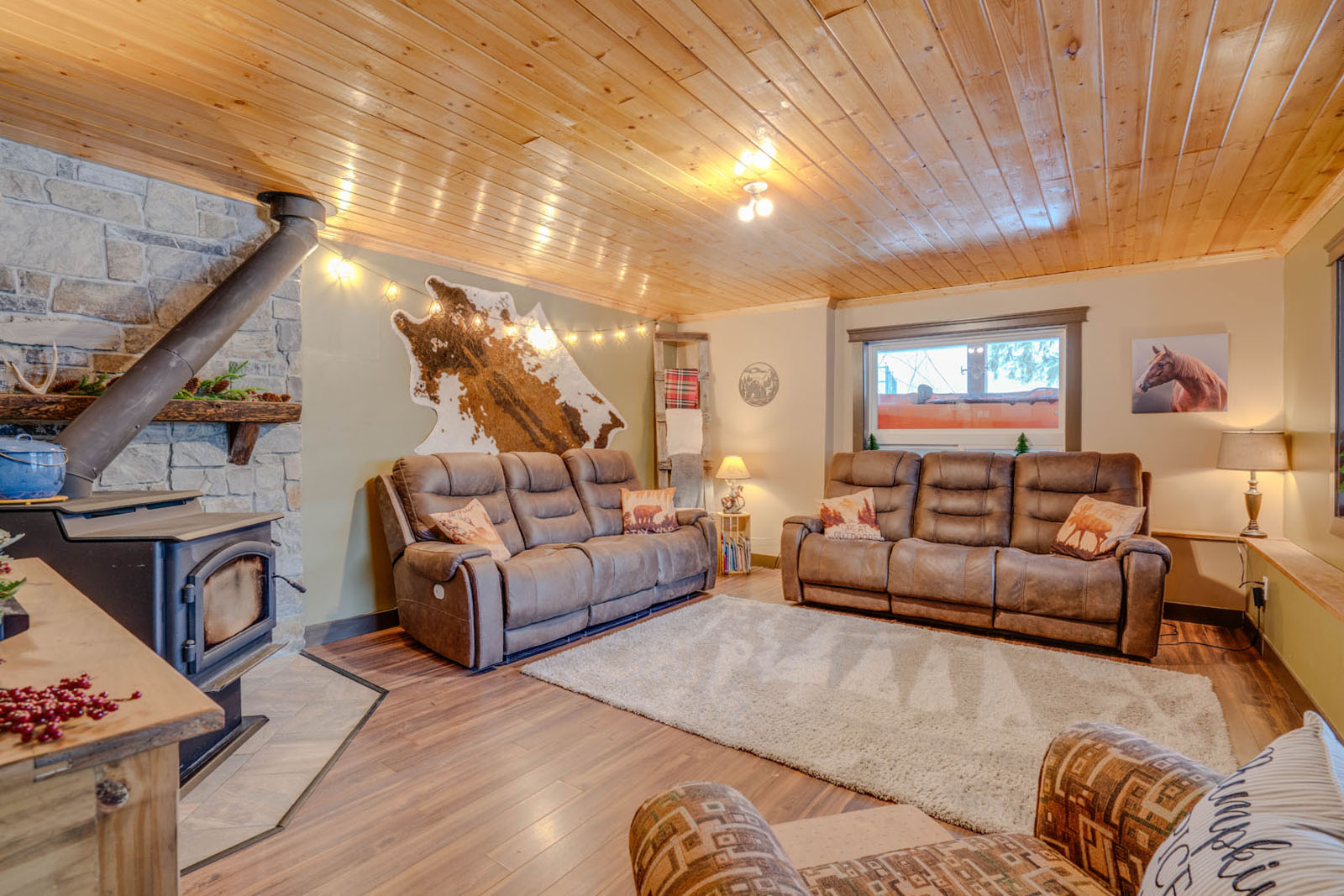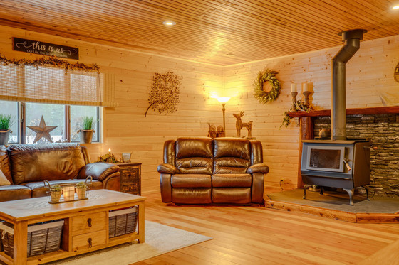 To the right, the family/living room features a freestanding wood stove providing efficient heating. The stove is enhanced by an extensive feature stone wall, a tile base, and a solid live edge wood mantel. With ample room, this area is well-suited for entertainment, recreation, or relaxation.