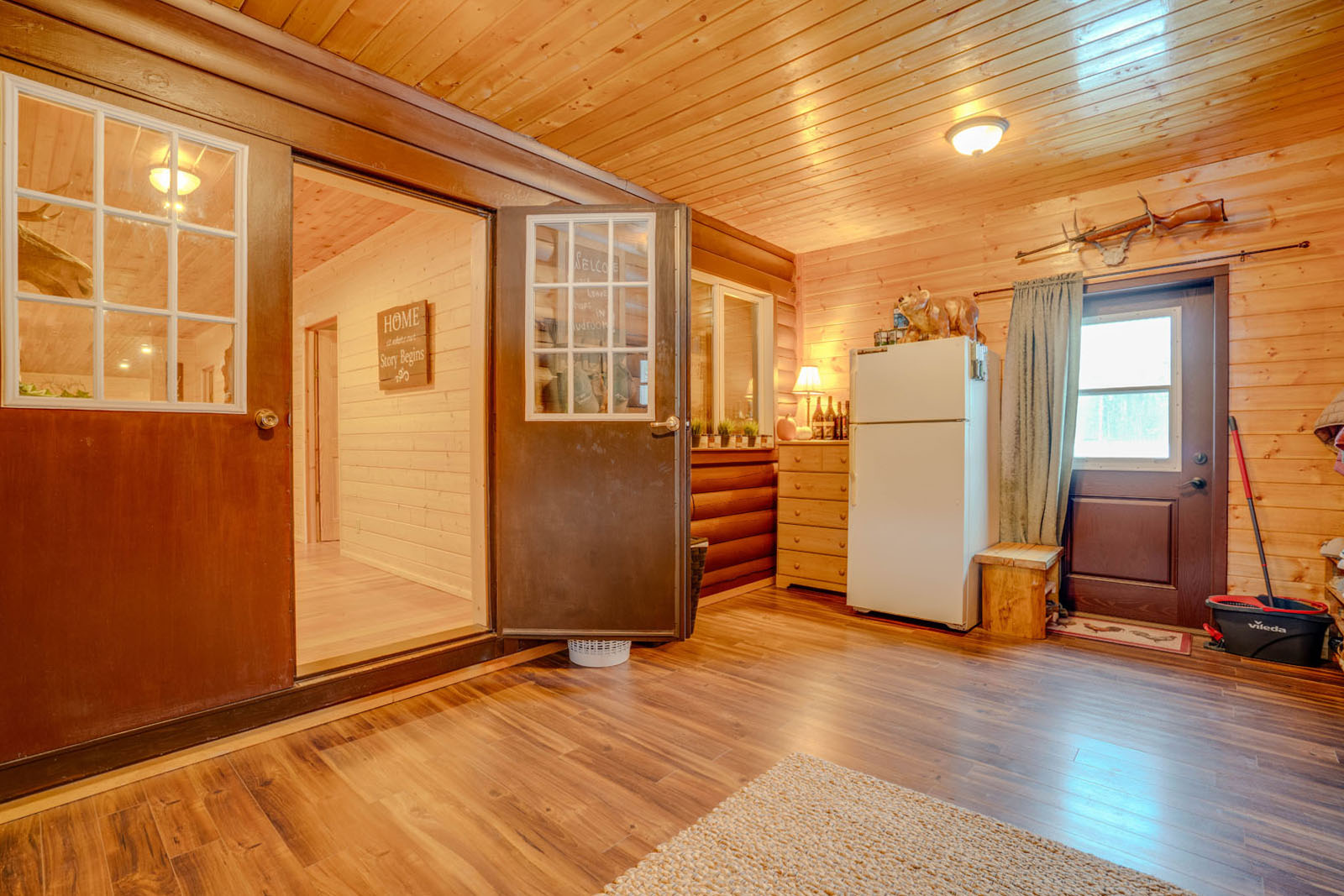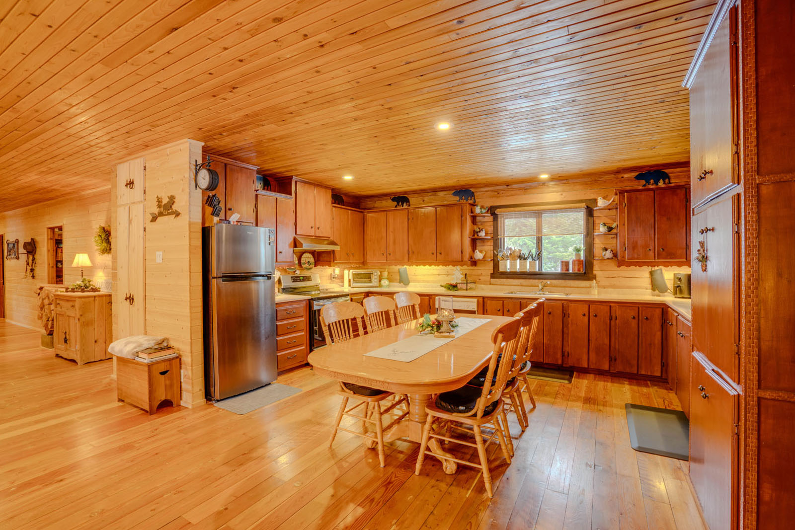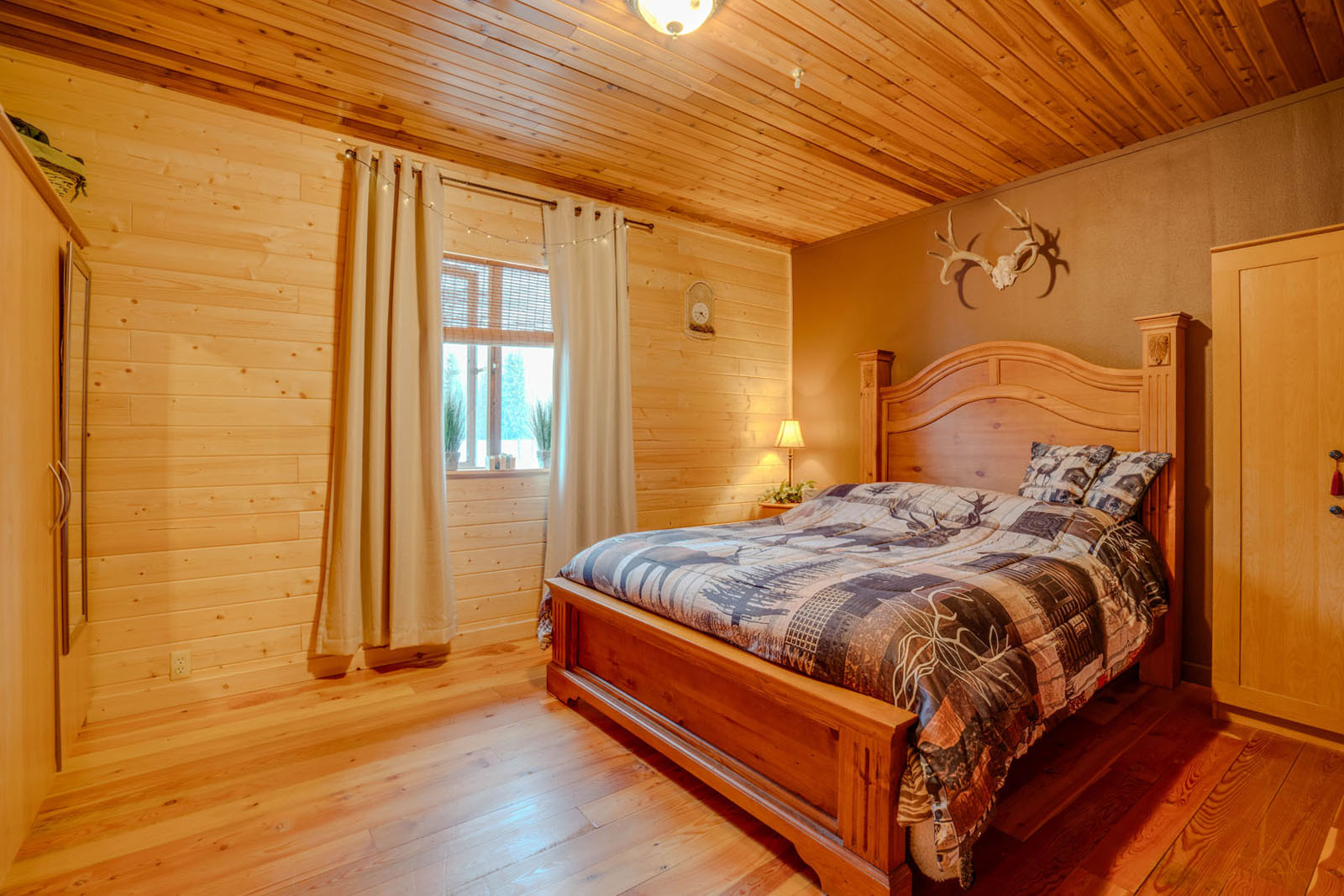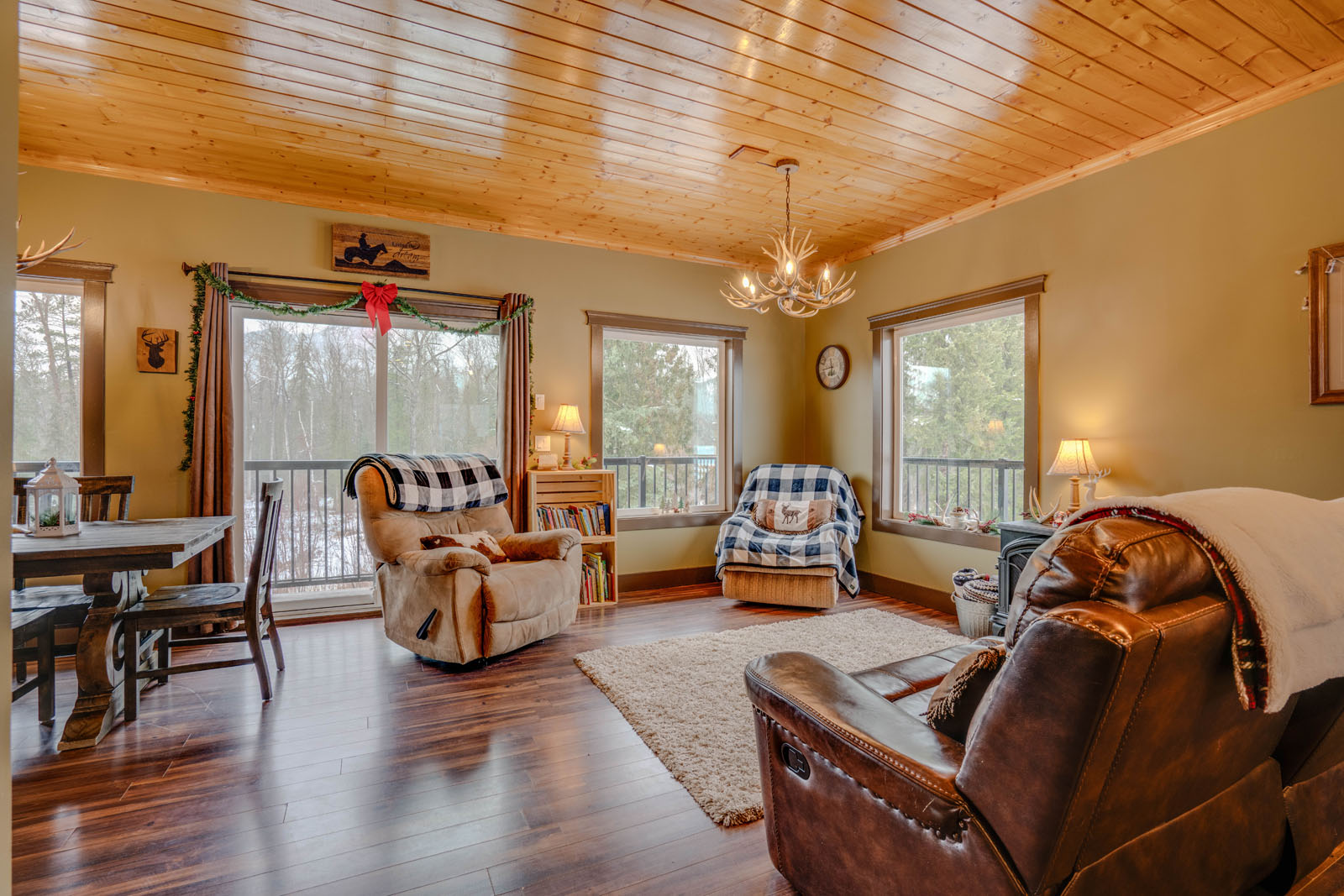 This log house evokes a sense of nostalgia and solid construction, with wood continuing to be the theme throughout this cozy home. Solid cedar lap board finish the ceiling while natural white pine lap board finish the walls. Hardy fir floors have gracefully maintained their beauty and integrity.