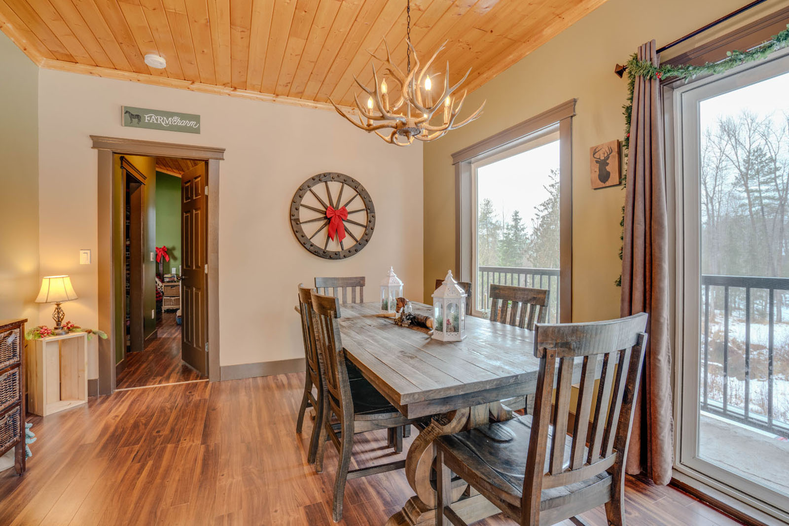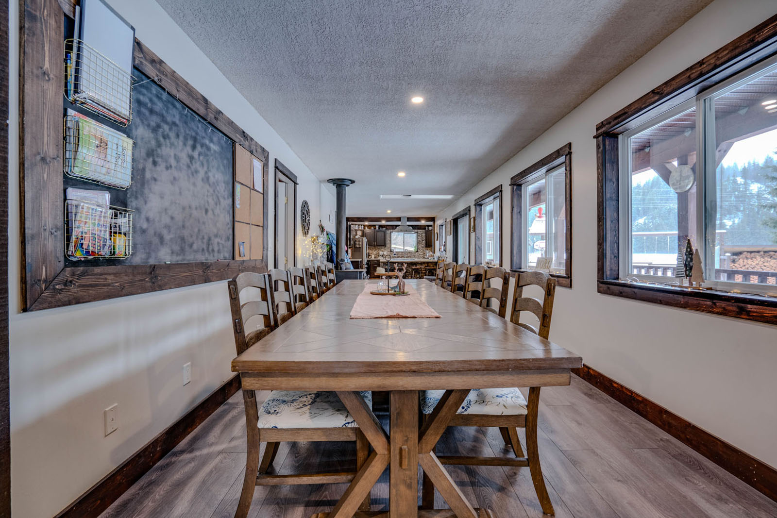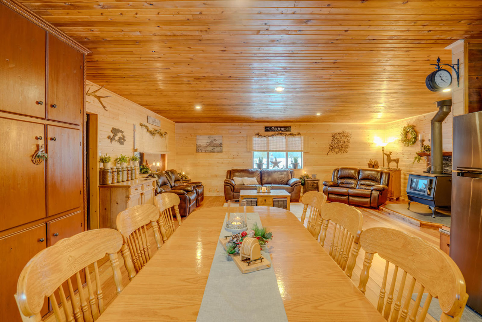 Meals are served in the adjoining dining area, with ample room for large or intimate groups. Plenty of space on each side of a lengthy table allows for a served or buffet-style meal. This gathering room is a joyful place for shared laughter and stories.