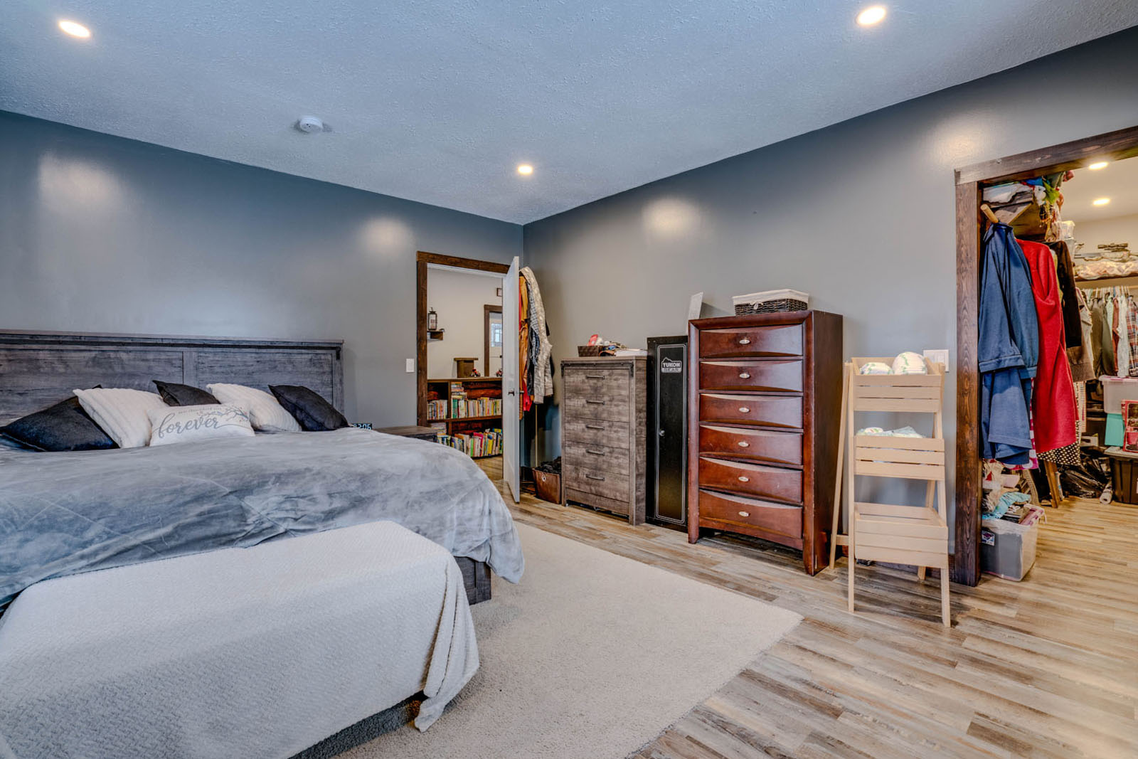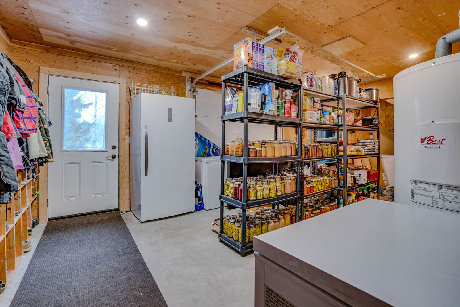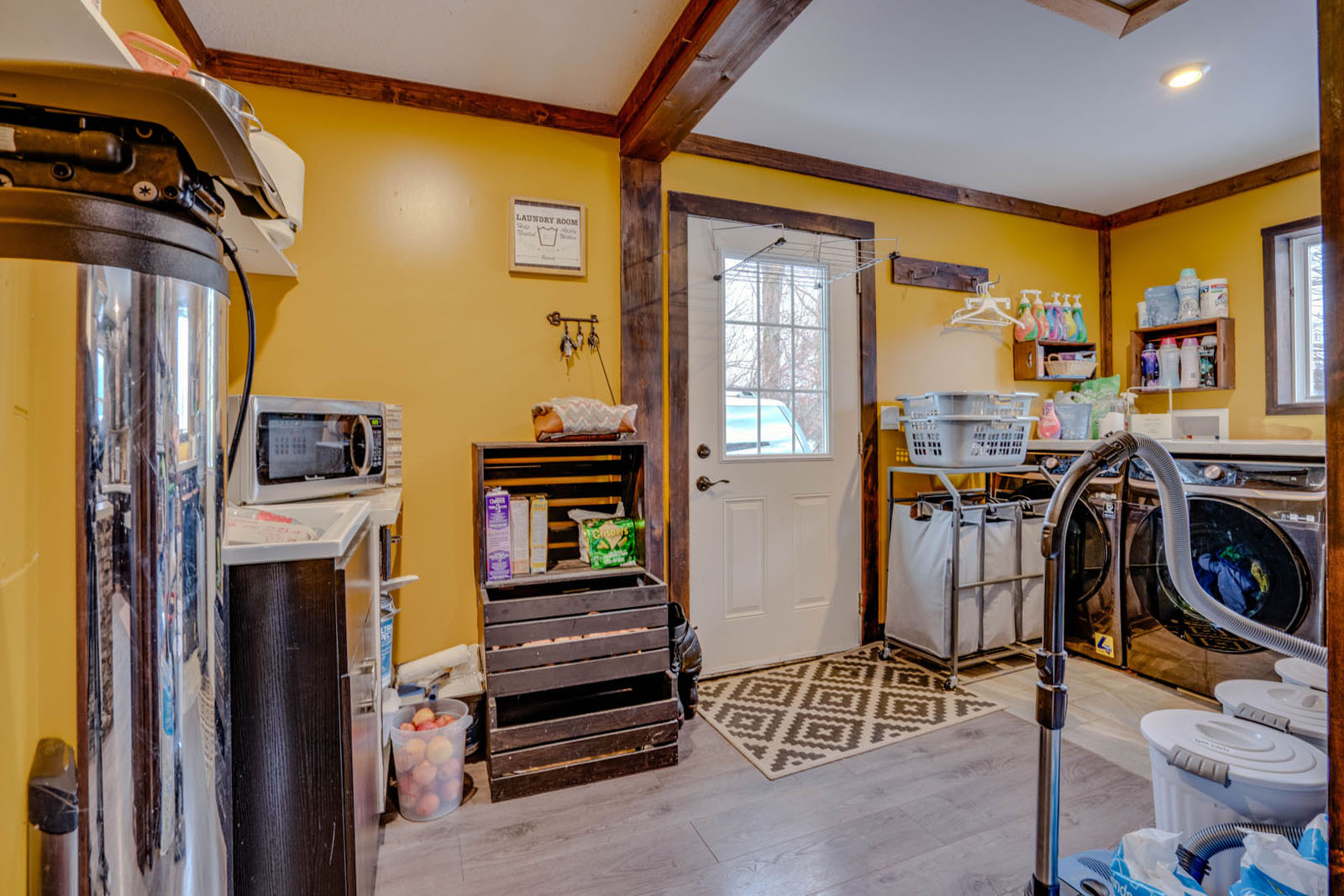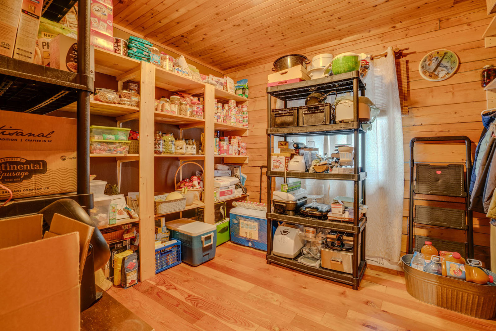 A grand hallway reaches through to the main entrance of the home with three bedrooms, a large pantry/storage room and a bathroom. The three-piece bathroom has laminated flooring and includes a washer/dryer. There are two entrances into a large mudroom with plenty of room for outer wear, additional storage area and appliances.