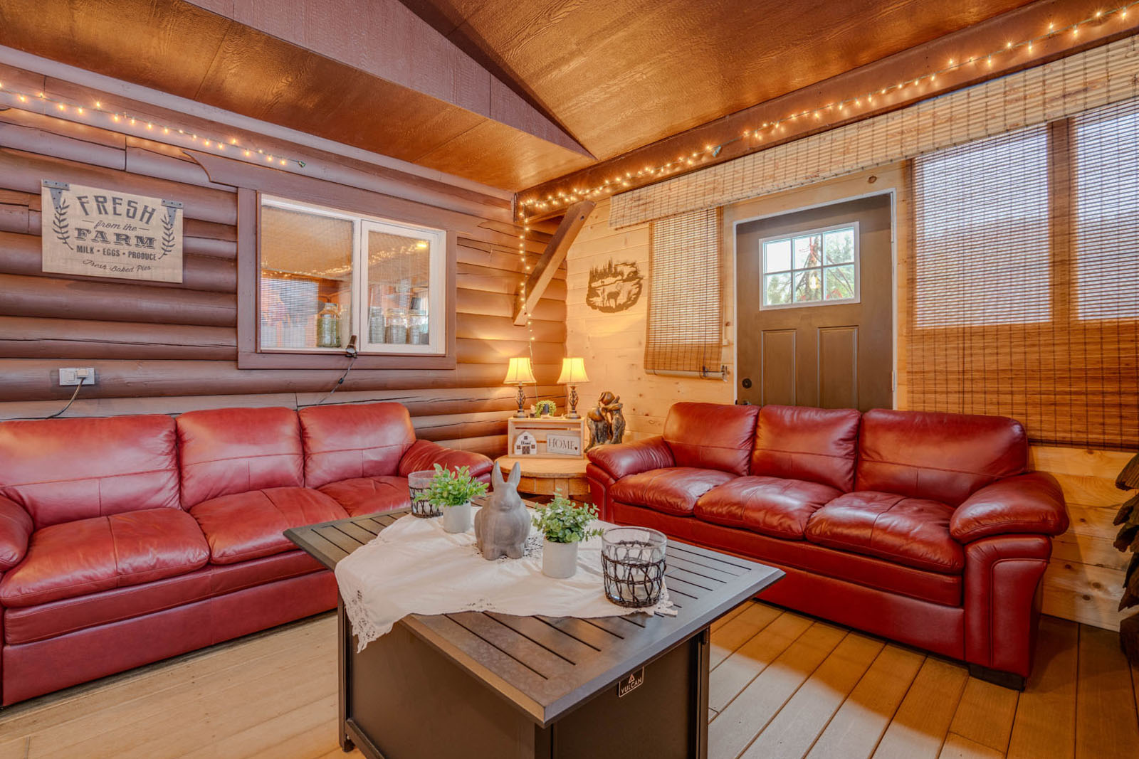 The adjacent living room is highlighted by a dramatic floor-to-ceiling rock fireplace, creating a focal point upon entry. The hearth is thoughtfully crafted from massive slate slabs, providing both visual impact and a sense of warmth. This feature not only enhances the room's rustic elegance but also serves as a gathering place for relaxation and unwinding.