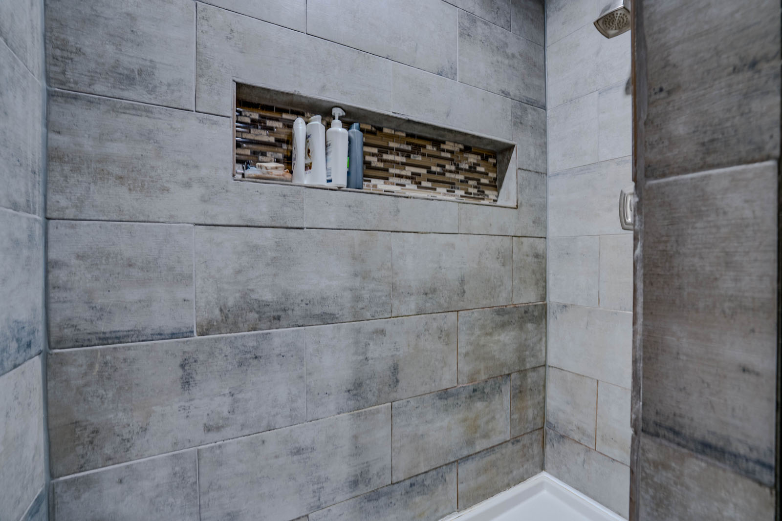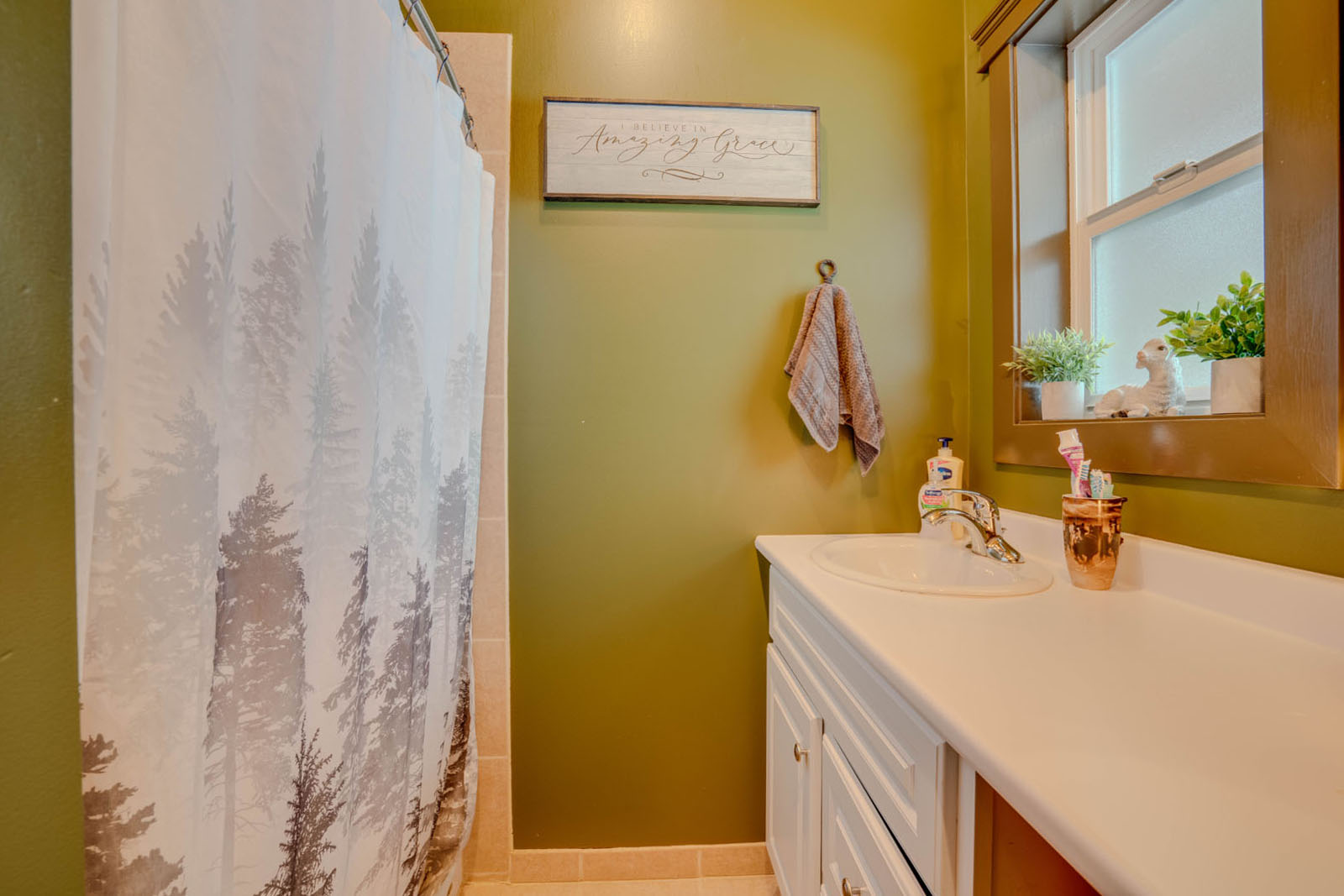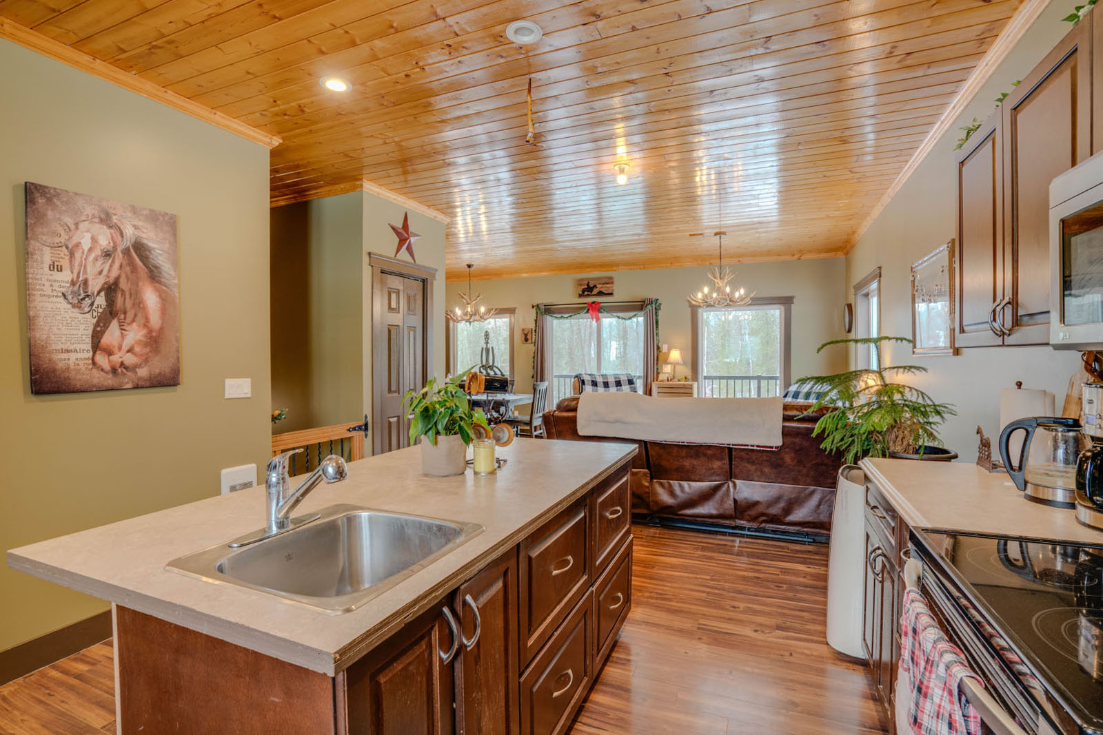 The upper level features an open-concept design that fosters a sense of connection and family interaction. The L-shaped kitchen is equipped with ample wood cabinetry and durable laminate countertops. A second sink, conveniently located in the island, enhances functionality and efficiency for meal preparation. A three-piece bathroom is conveniently located adjacent to the kitchen.
