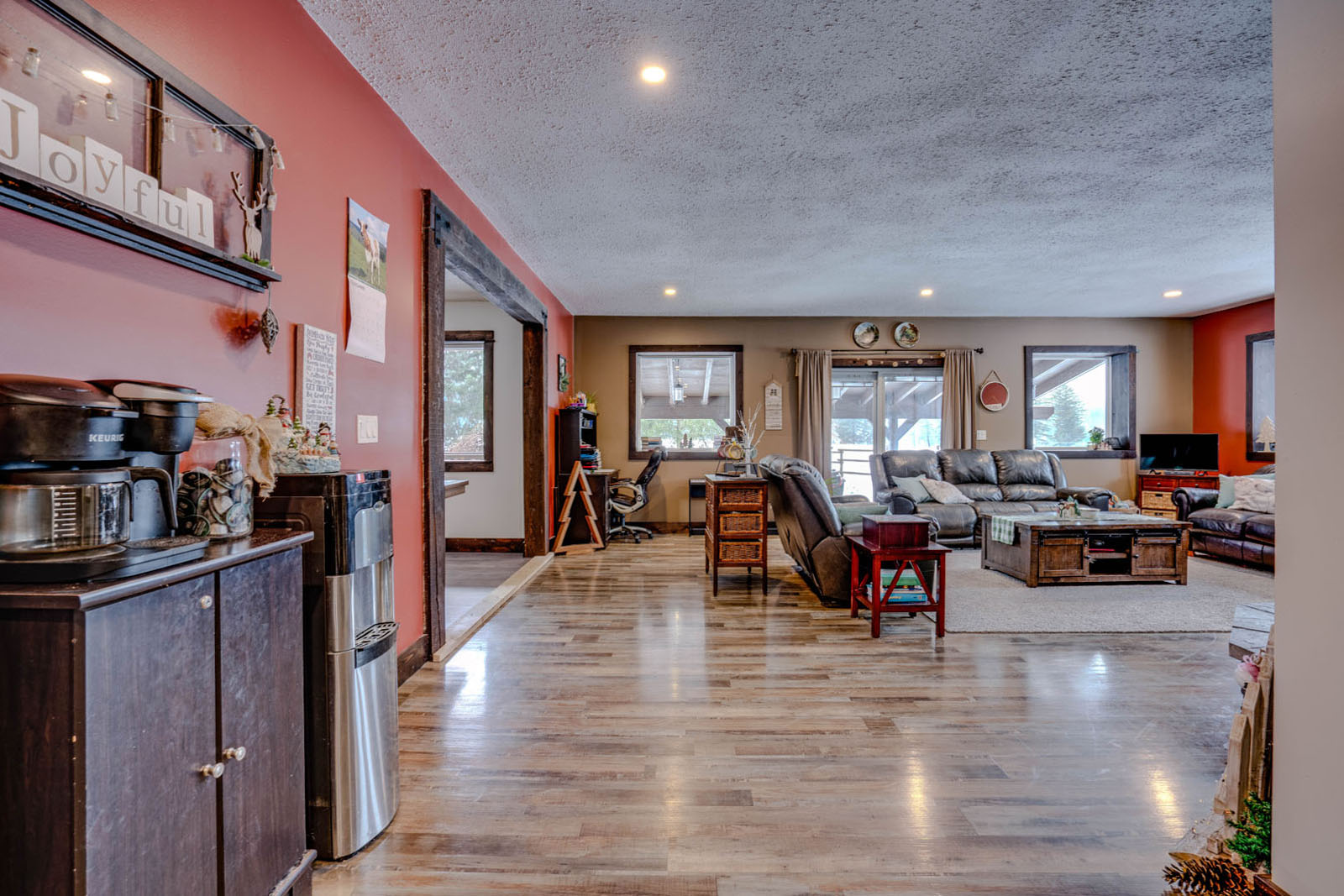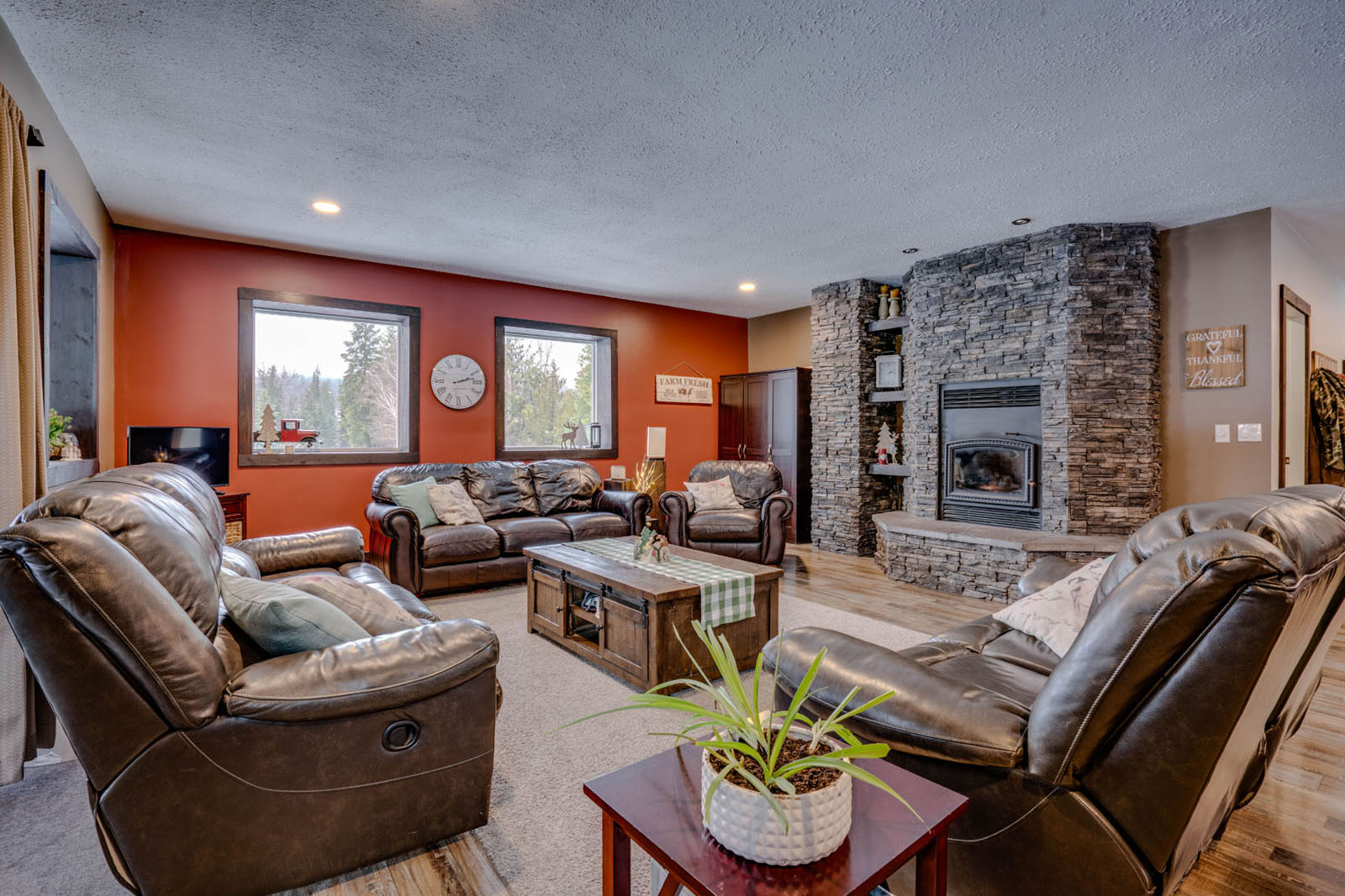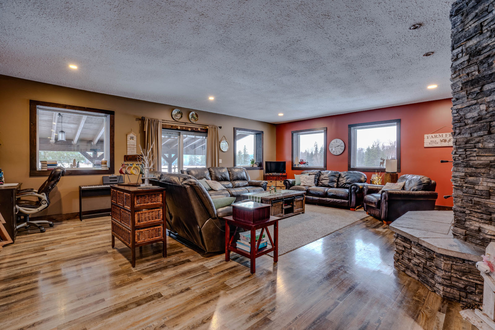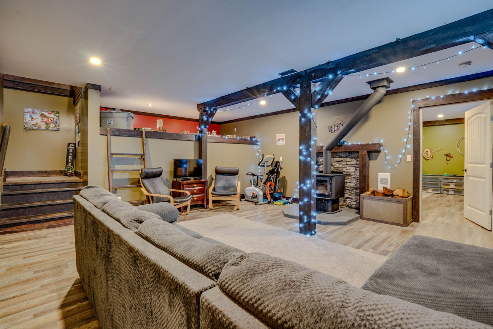 The living room is very generous and spacious allowing multiple couches, recliners and ottomans. A cheery free standing wood stove ensures the home is always kept at a pleasant dry and comforting heat. A custom rock feature behind the stove provides not only a heat barrier but also sports a beautiful solid wood mantel. The coloured concrete base provides protection and is an appealing complement to the rock.