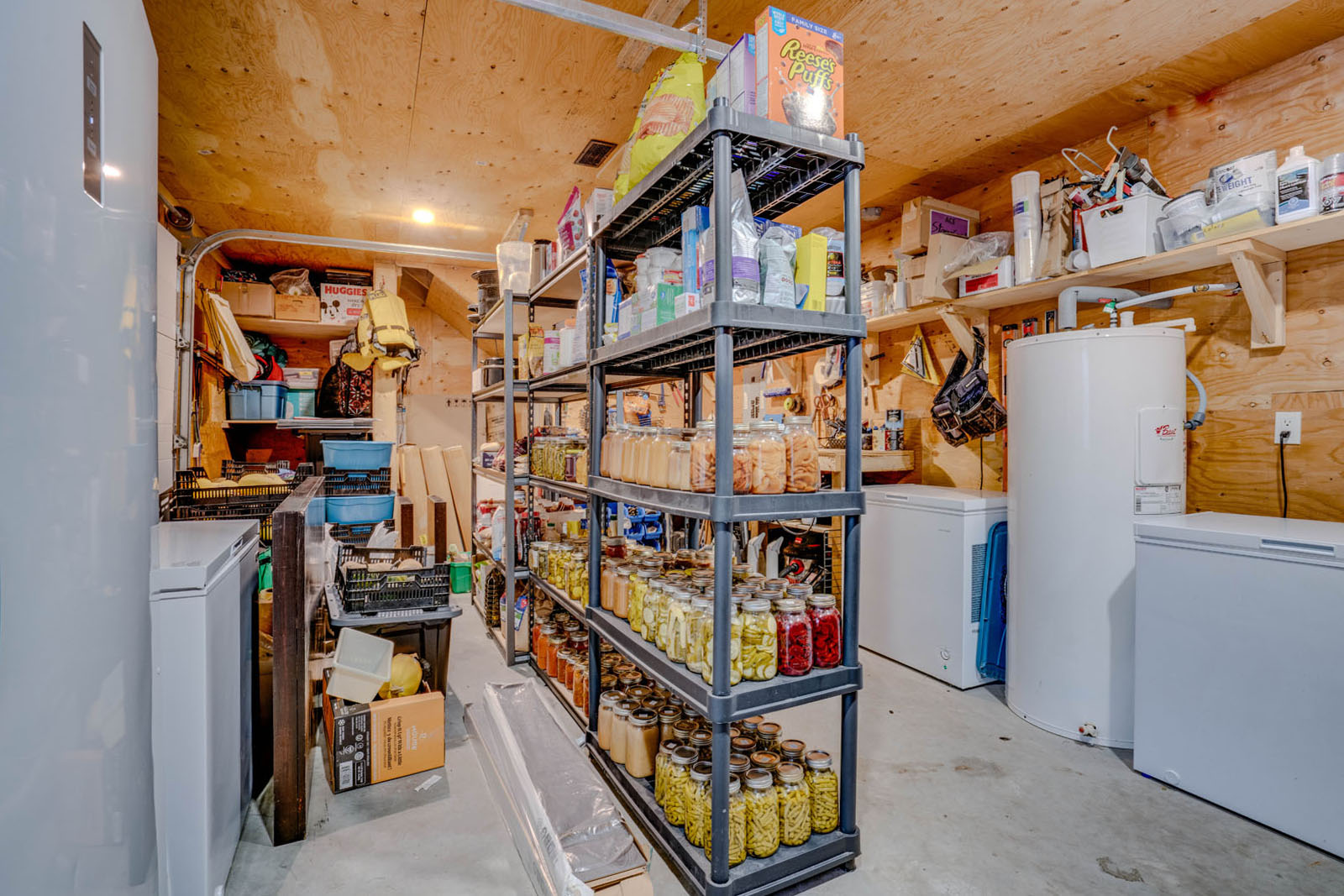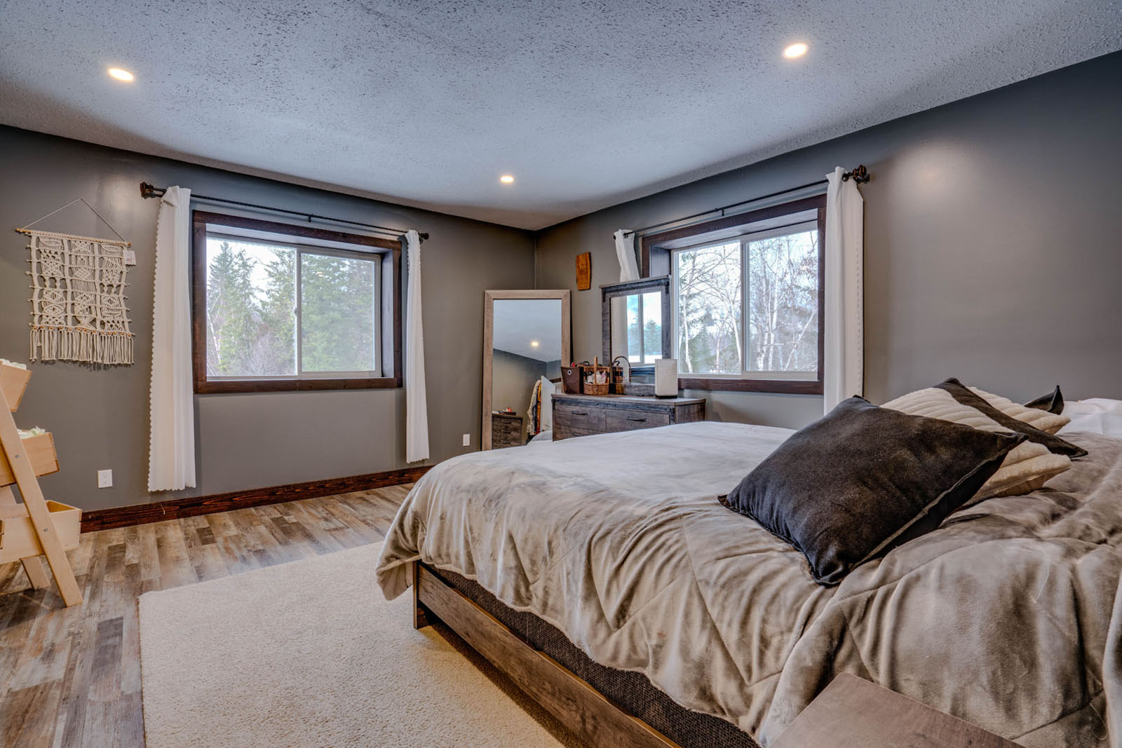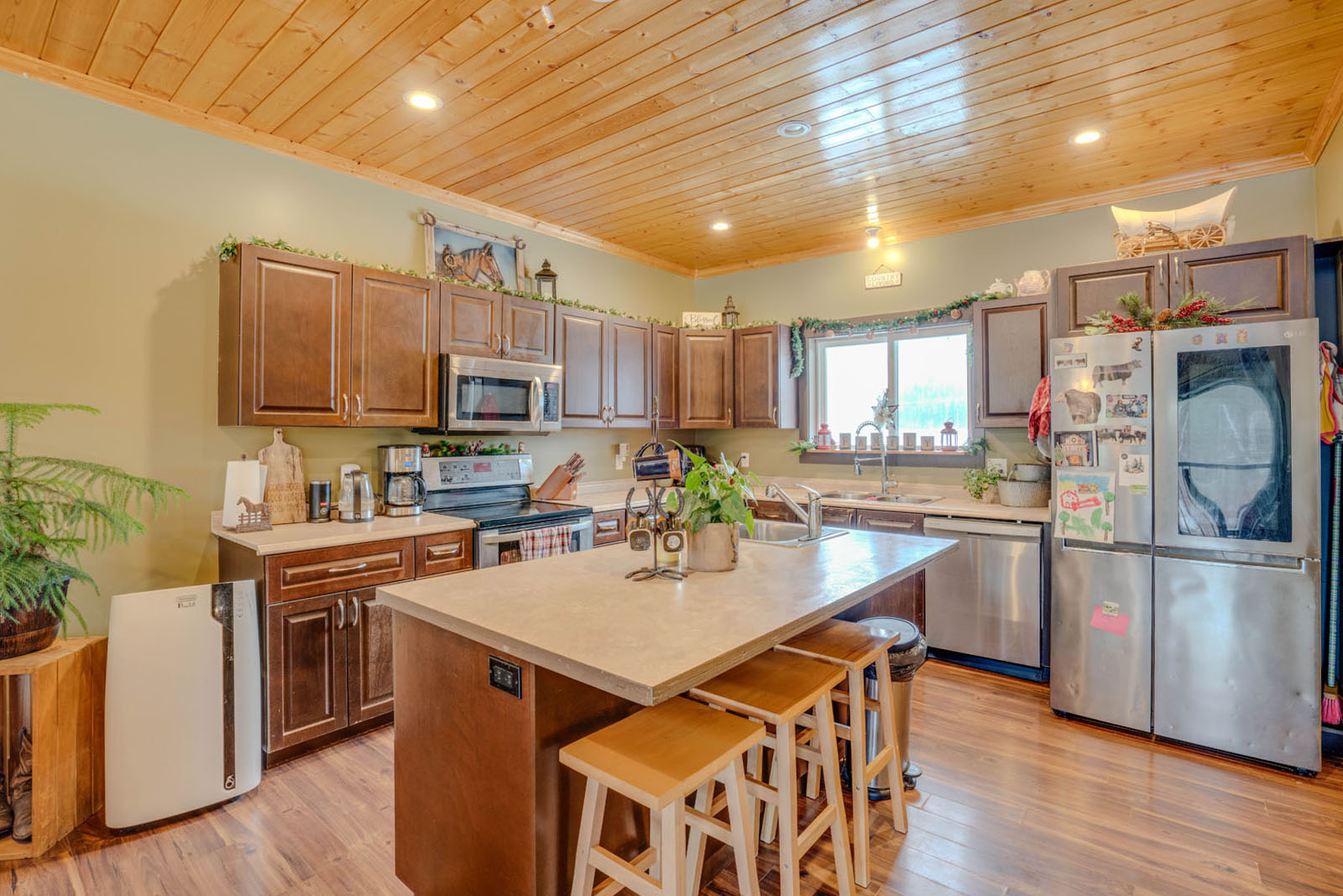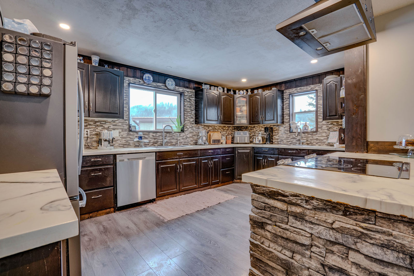 The living room is very generous and spacious allowing multiple couches, recliners and ottomans. A cheery free standing wood stove ensures the home is always kept at a pleasant dry and comforting heat. A custom rock feature behind the stove provides not only a heat barrier but also sports a beautiful solid wood mantel. The coloured concrete base provides protection and is an appealing complement to the rock.