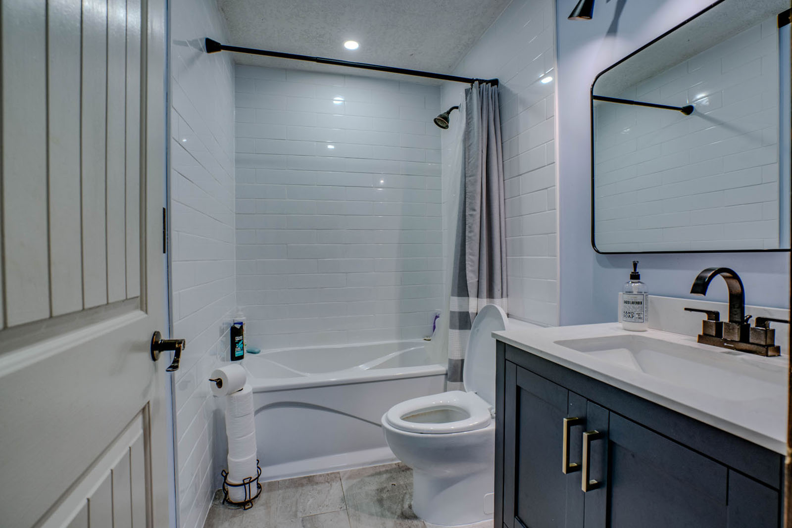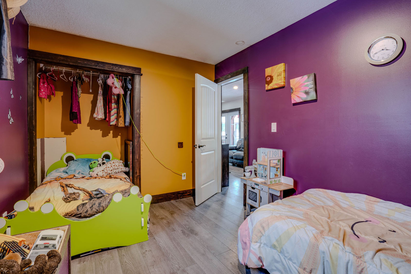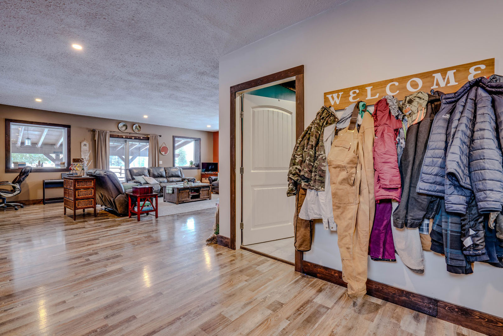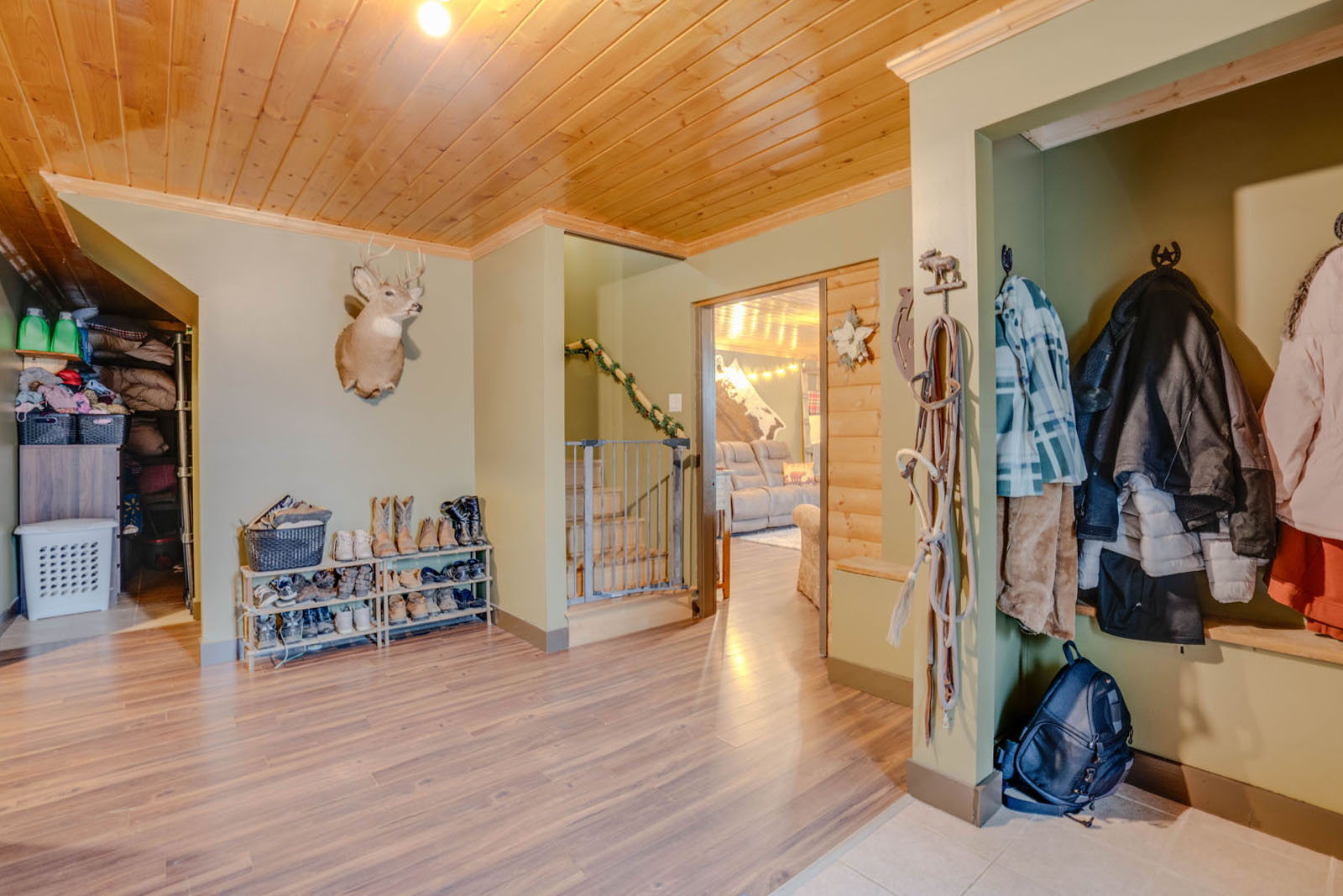 This two-storey residence features dual entrances—one accessible from the main level and another from the upper deck. The lower-level entrance opens into a spacious foyer designed to accommodate plenty of outerwear and gear.