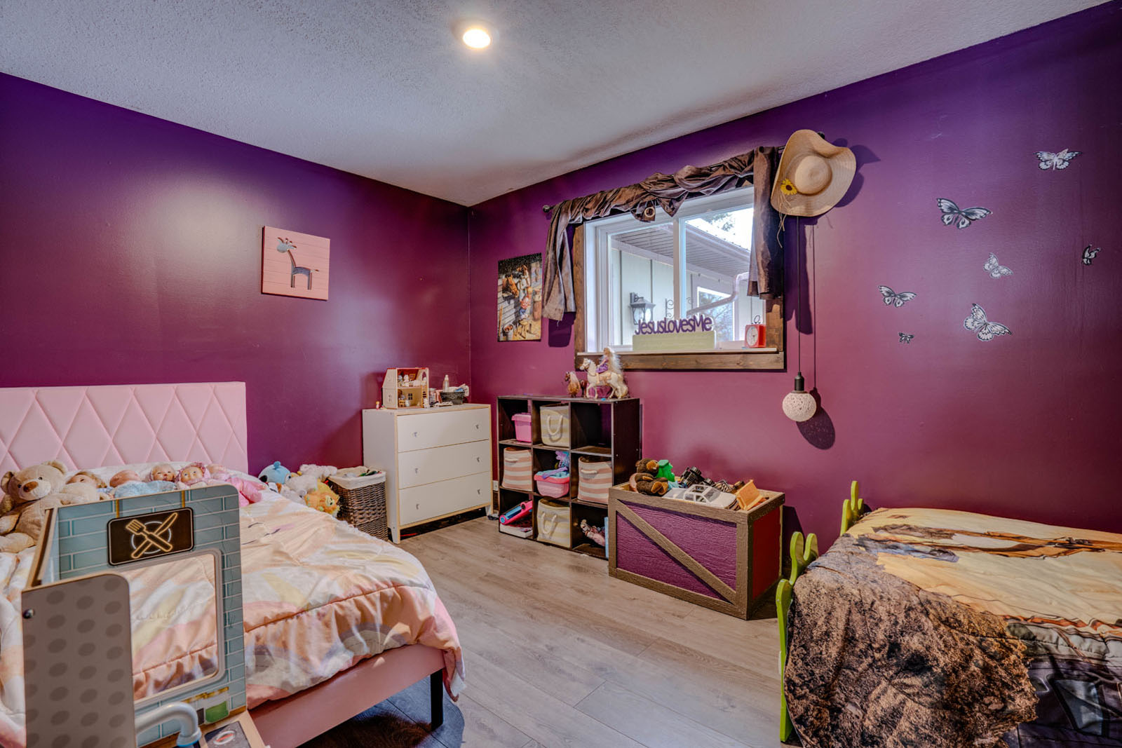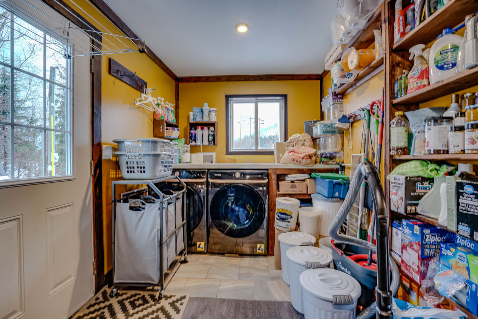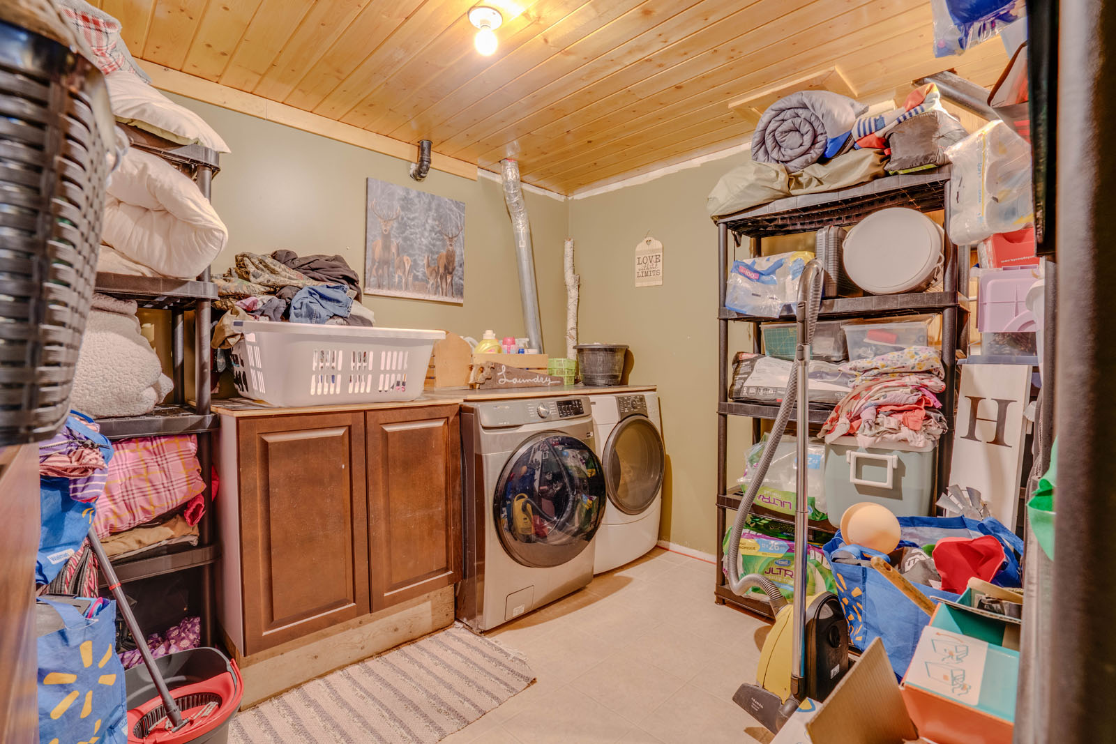 The spacious laundry room offers additional storage area. Additionally, this level includes two bedrooms and a two-piece bathroom. A staircase from the entrance leads to the main living area on the upper floor.