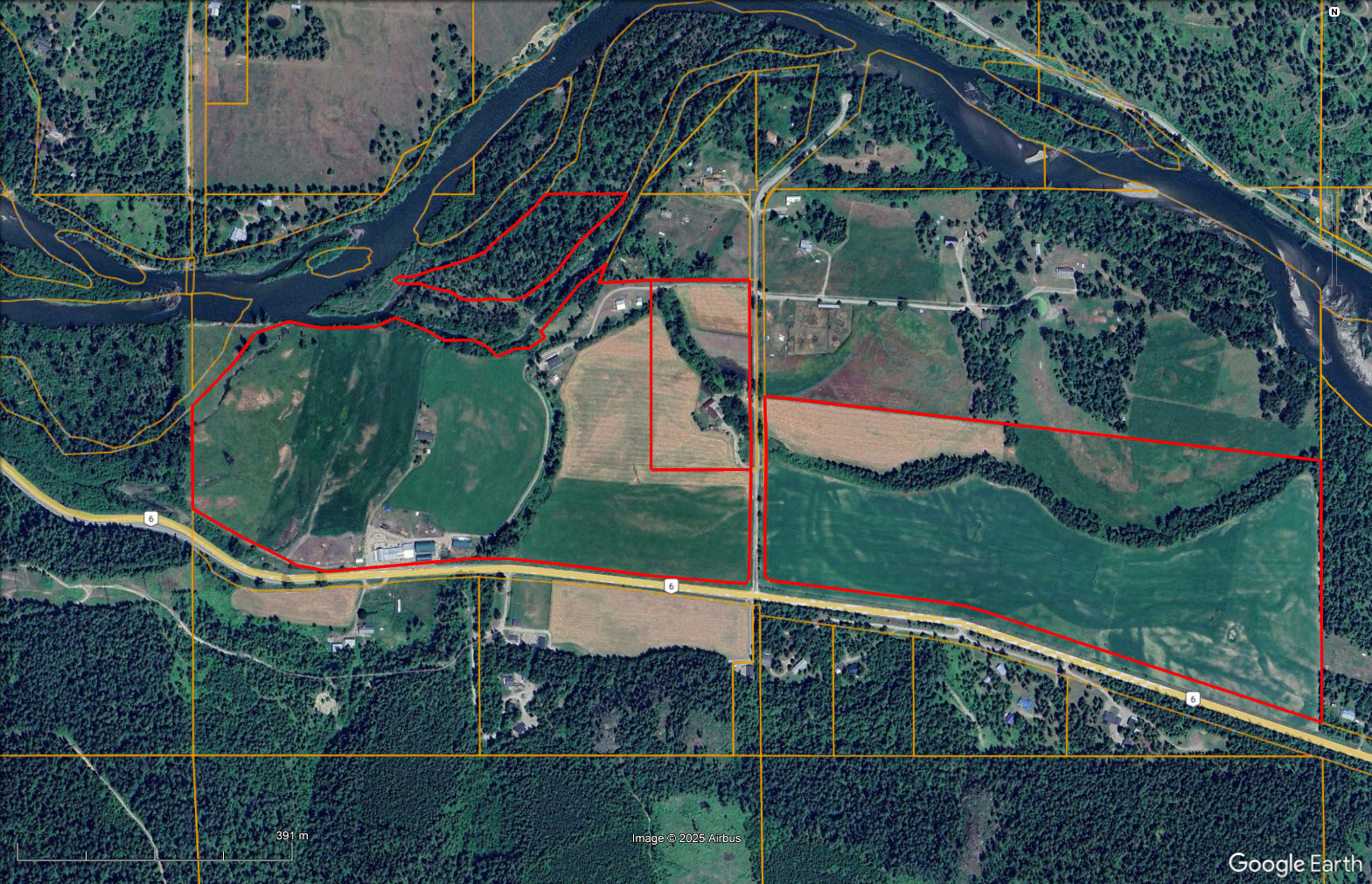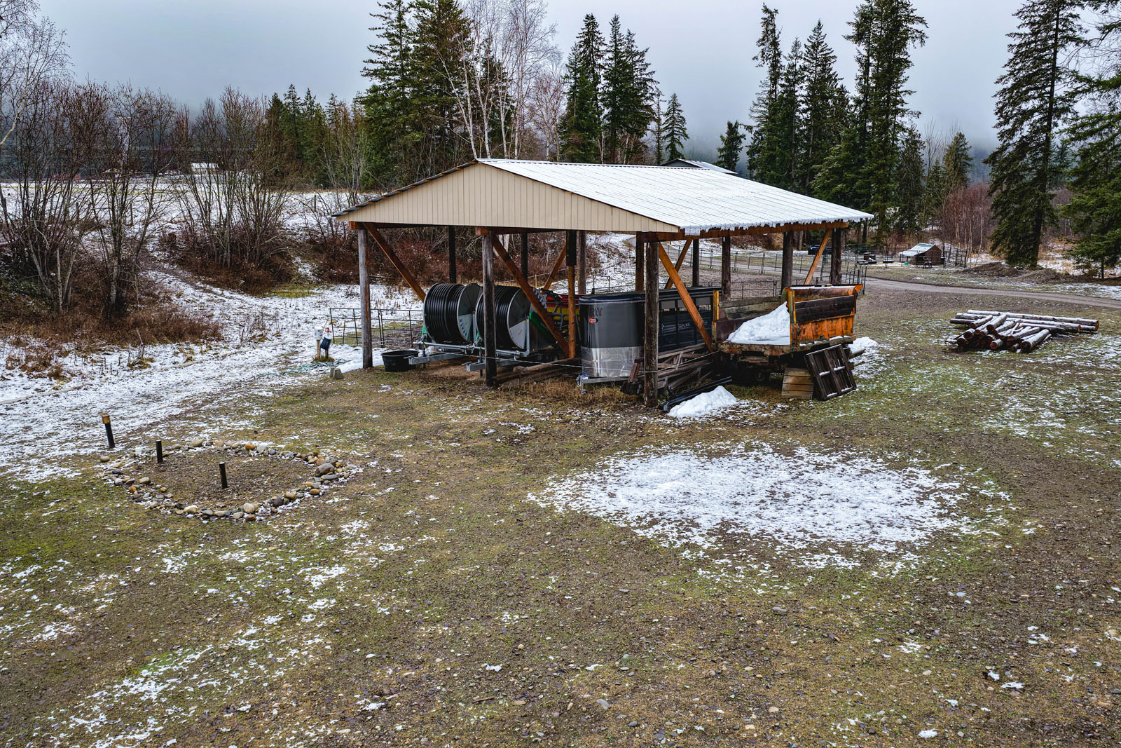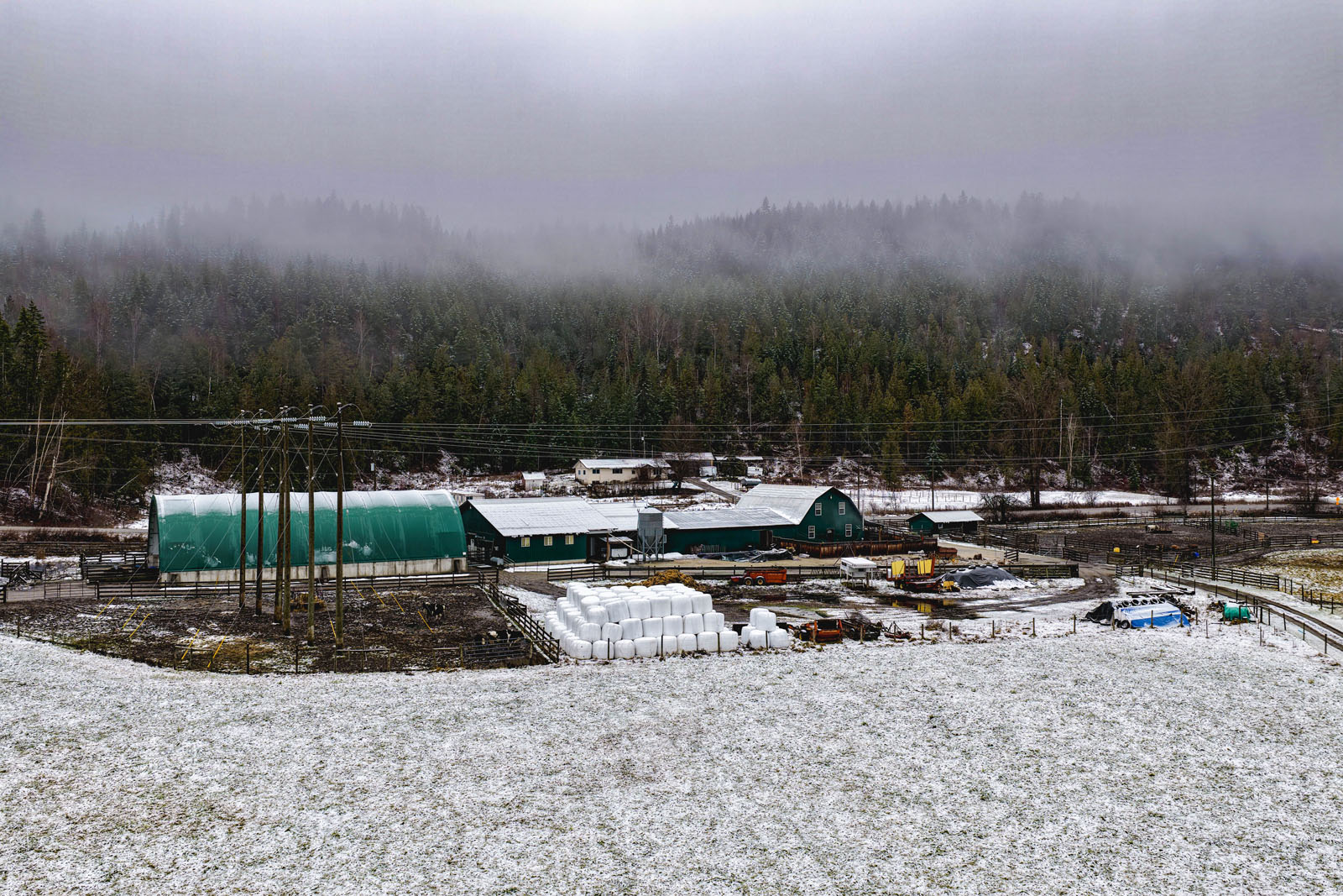 The Highway 6 frontage portion of the property is home to the two-storey main residence and the core agricultural infrastructure. A second log home residence is located further back on the property, offering privacy and separation from the highway frontage. Combined, these improvements create a highly functional secondary living area suitable for extended family, guests, or supplemental residential use.