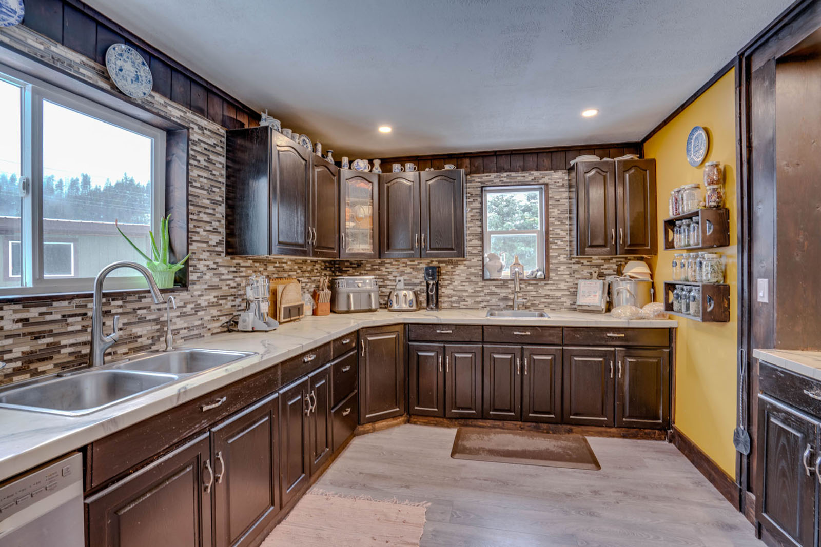The open concept between the kitchen and living/dining rooms create a sense of ‘community’ and togetherness within this home. The U-shaped kitchen has an abundance of upper and lower solid wood cabinets. Undercabinet lighting ensures all working areas are well lit and without shadows. Plenty of laminate countertop have two double stainless-steel sinks, each with built in upper feature shelves surrounding the windows. This kitchen’s width easily allows for a full-size kitchen table set with adequate space for cooks to whip up the daily fare.
