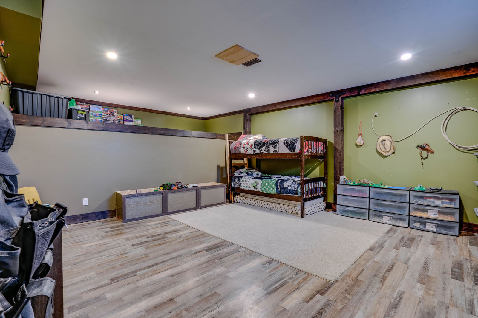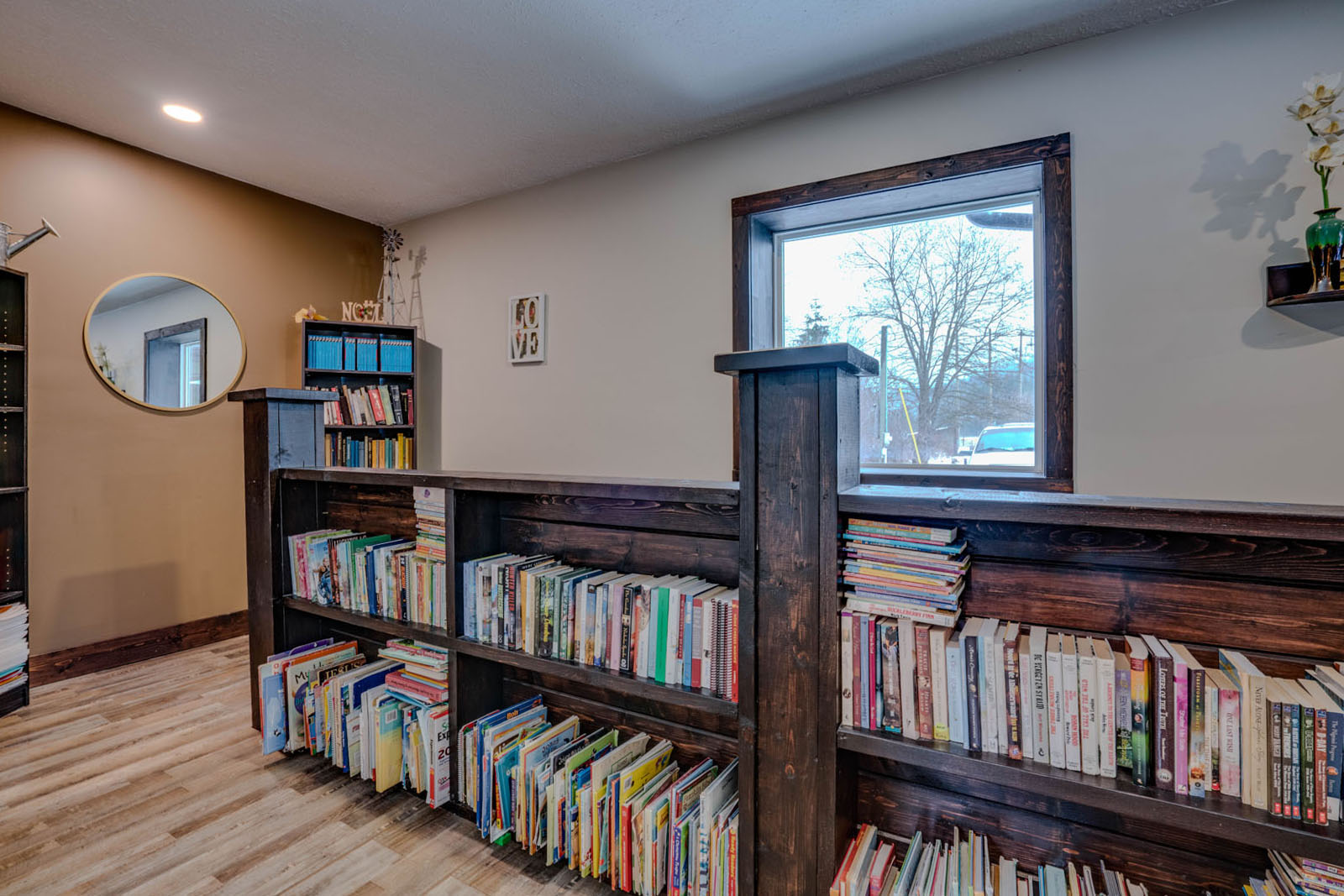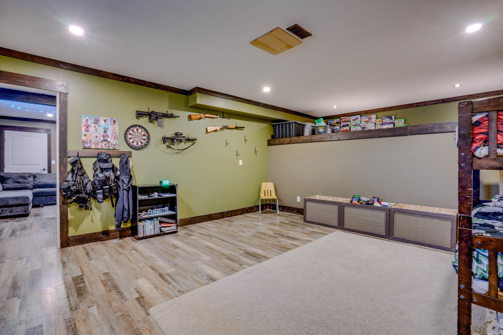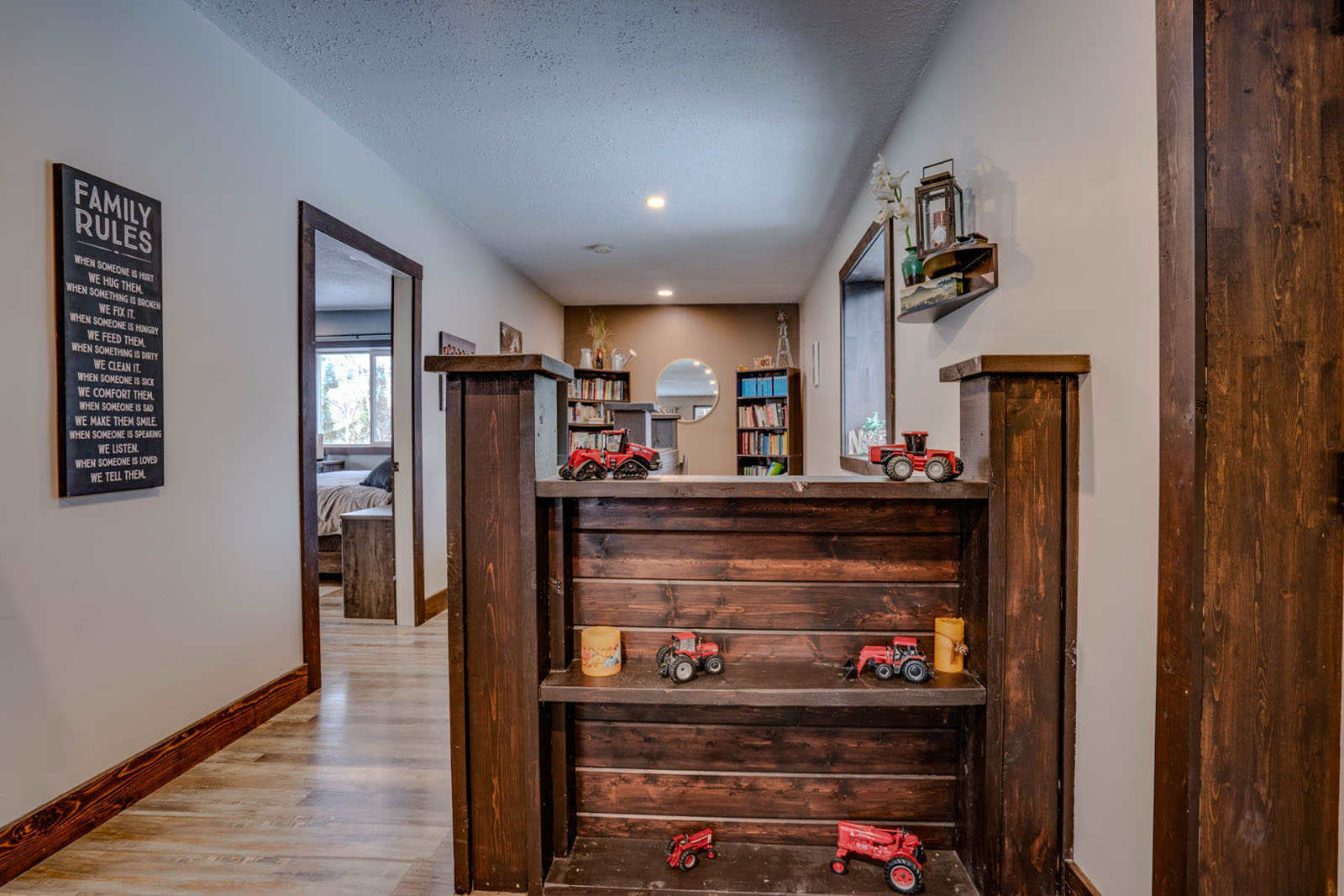 A wide hallway with a built-in bookshelf leads to stairs and the lower walk-out level. The spacious family or recreation room provides ample space for games, relaxation, or movie nights. An adjacent room offers sufficient area for multiple beds, crafts, projects, or an indoor workshop. Additionally, there is access from the family room to an entryway and utility room. The area provides plenty of storage, and an overhead garage door adds convenience for access.