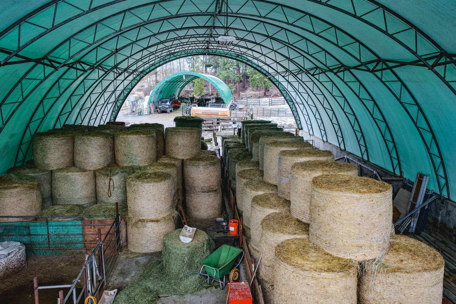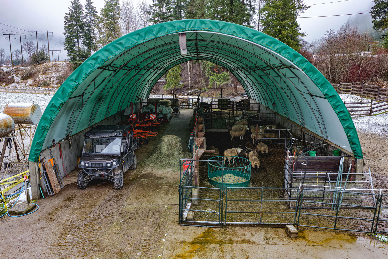 Supporting the former farm operation are multiple large, covered equipment and hay storage structures, all supplied with electricity and constructed on concrete footings: