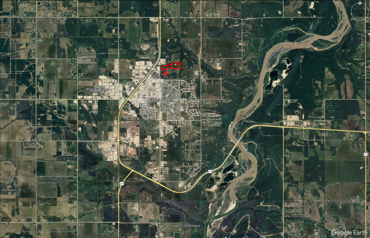 One of the largest acreage parcels inside Drayton Valley's town limits at 38.68 acres. Featuring open farmland, mature trees, and an existing gravel road, with shops and services just minutes away. Zoned Residential Acreage with a wide range of permitted uses—the possibilities are wide open.