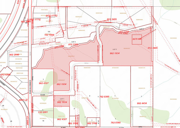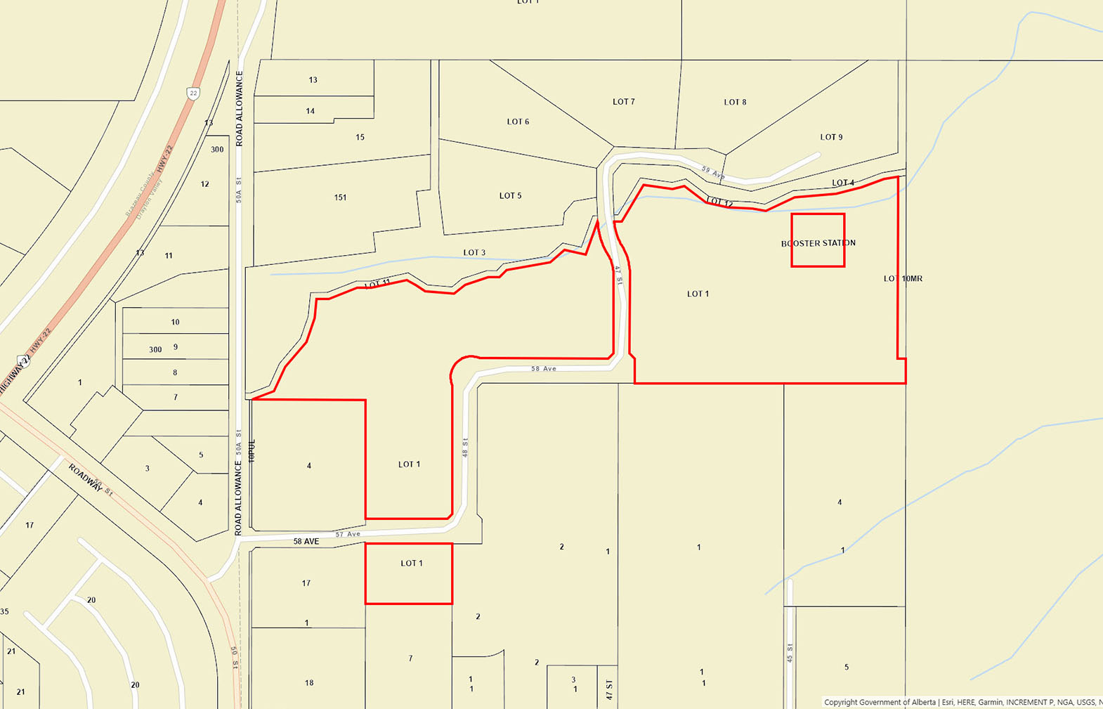 Currently operating as farmland, the property strikes an ideal balance between open, usable space and pockets of mature trees that provide natural privacy and character. A gravel road already runs through the property, offering practical access throughout. The sheer size—nearly 39 acres inside municipal boundaries—makes this one of the largest residential lots available within Drayton Valley's town limits.