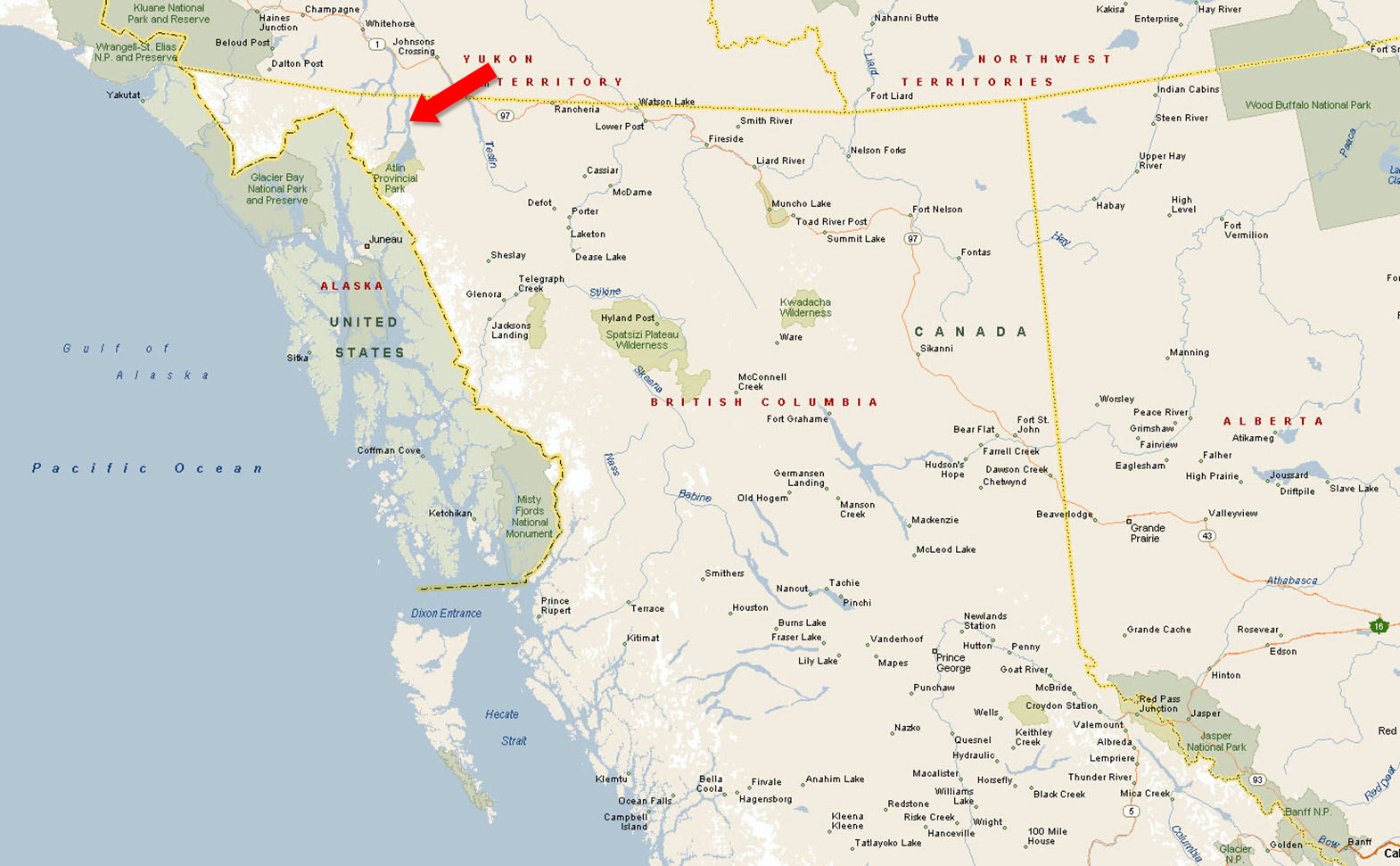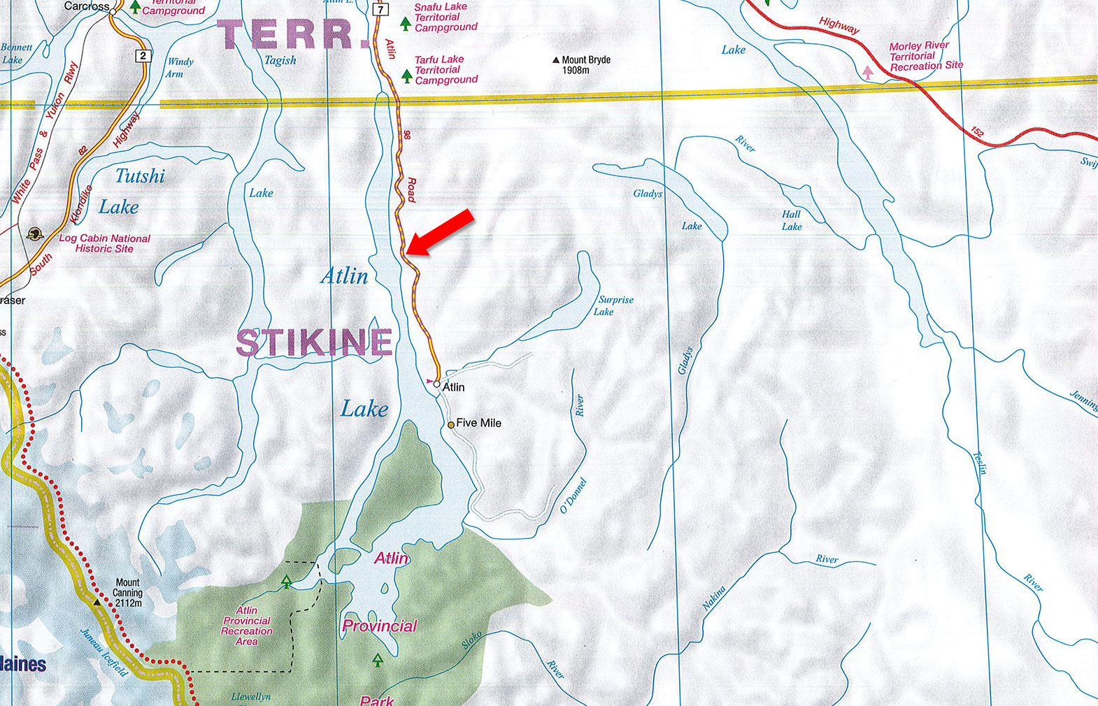 The road from Atlin to Whitehorse is a 175 km trek along the Alaska Highway. Whitehorse is the largest centre in Yukon and functions as the commercial gateway for many northern BC communities, including Atlin.