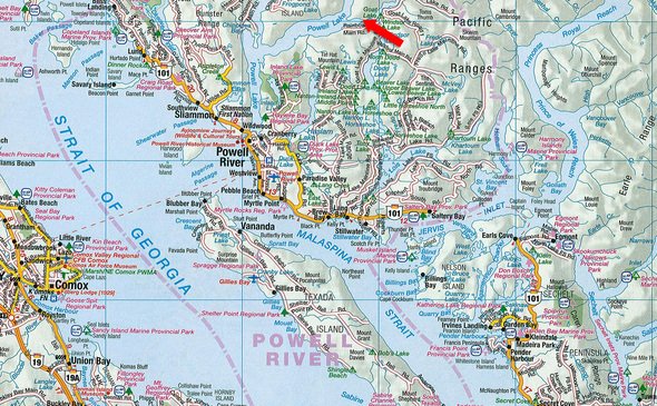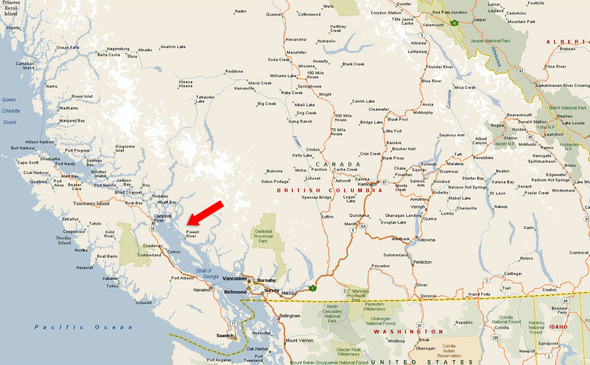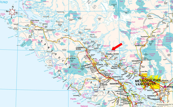 Powell River is located on the coast of British Columbia approximately 145 km (90 miles) north of Vancouver and immediately across from Courtenay on Vancouver Island.