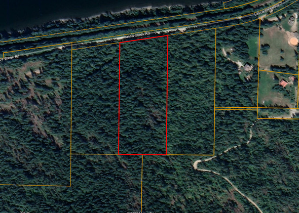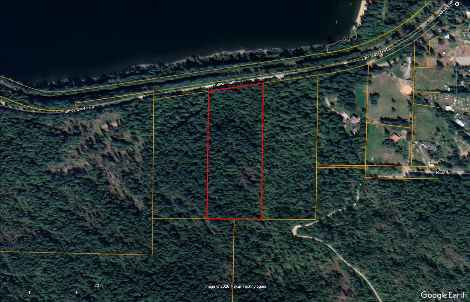 Access is via the Harrop-Procter cable ferry, a short 5-minute crossing that runs on demand, 24 hours a day, 7 days a week. The property fronts onto Lasca Creek Road, providing reliable access in all seasons.