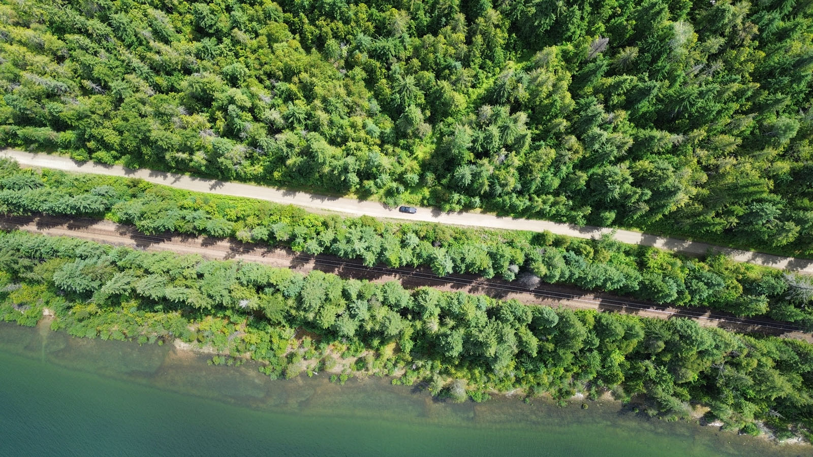 A path across the road and rail line leads to a quiet stretch of Kootenay Lake shoreline, offering convenient access to the water.