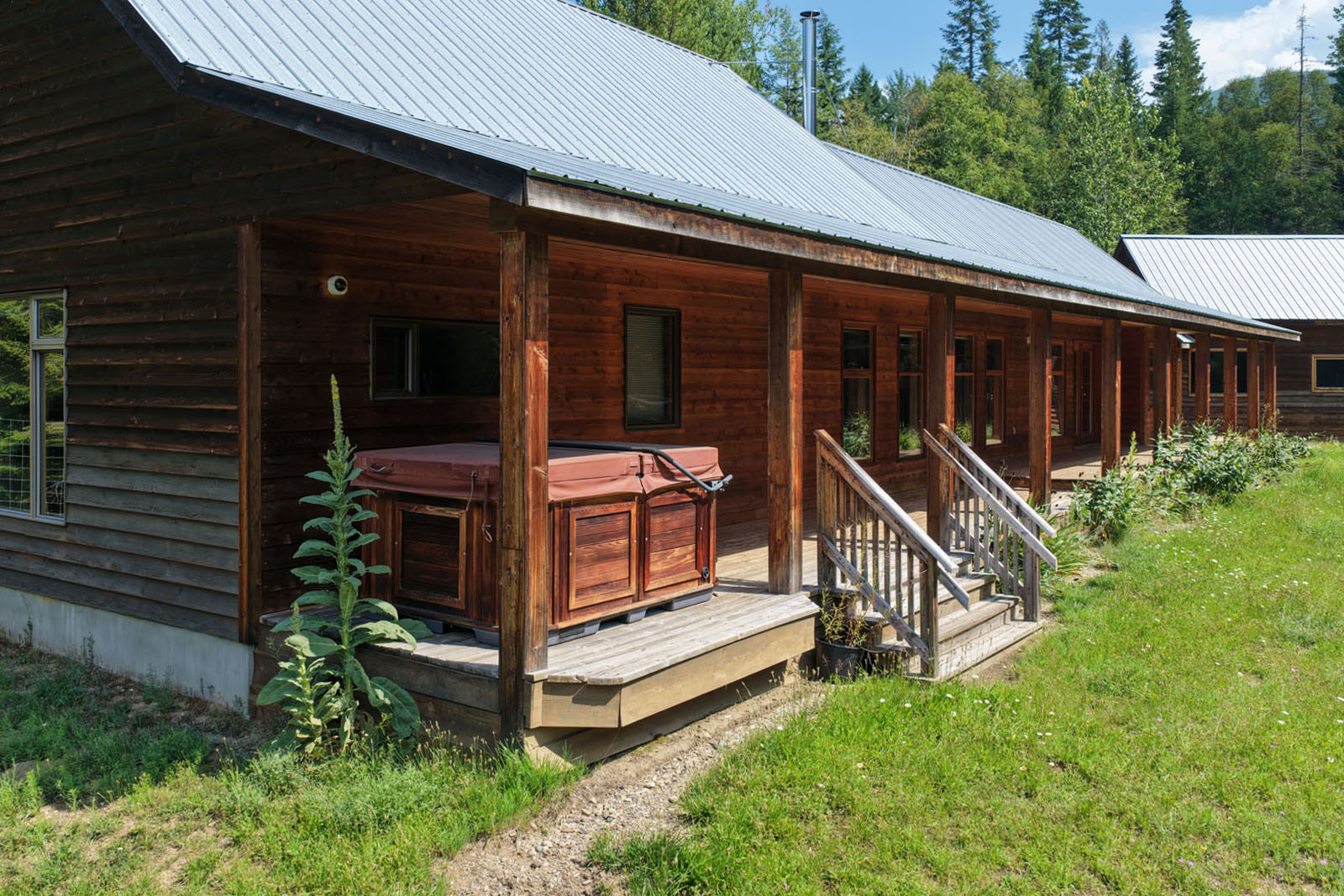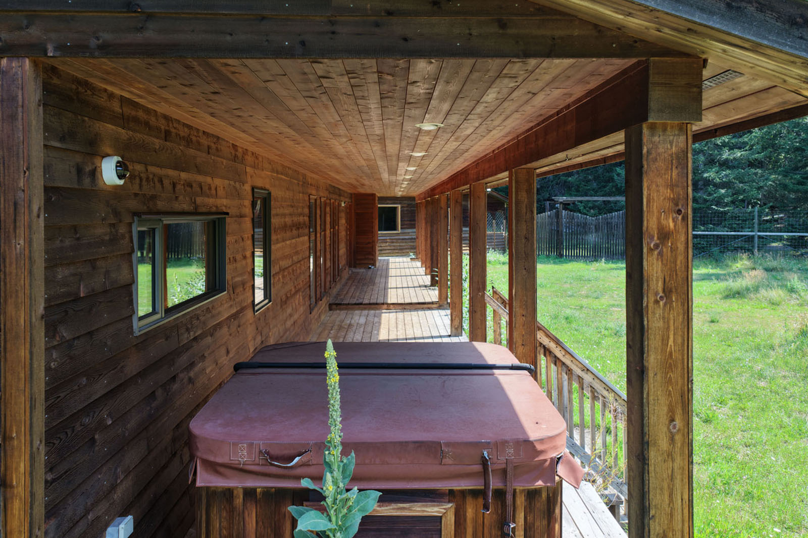 The Main House is a charming 3-bedroom, 1-bathroom home with a gym area and lofted yoga area featuring an open-concept kitchen and dining area, highlighted by high-end wood finishes and beautiful stained-glass feature windows that bring warmth and natural light into the space. There is a custom rock fireplace in the middle of the home for providing comforting heat at all times of the year. Step out onto the massive balcony and take in the peaceful views of the flat, fenced-in pastures that stretch out in front of the home—ideal for livestock, gardens, or simply enjoying nature.