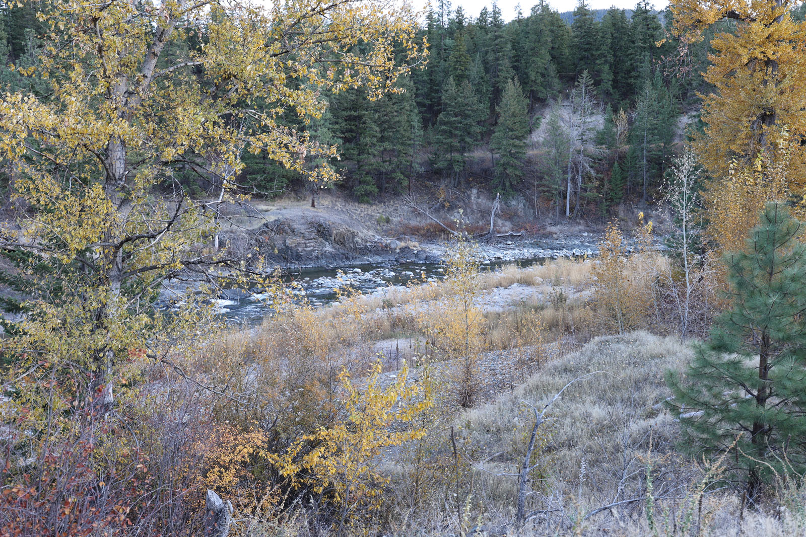 Moving upslope from the creek, the vegetation transitions into open forests of Douglas fir and Ponderosa pine, adapted to the region’s dry summers and cold winters. These stands are typically park-like, with grassy understories and occasional shrubs that thrive in the well-lit, dry conditions. Along the creeks themselves, riparian vegetation forms a lush contrast to the surrounding dryness. Streambanks are lined with willows, alders, cottonwoods, sedges, and moisture-loving grasses that stabilize the banks and provide shade for fish and wildlife. These green corridors add texture and ecological richness to the valley.
