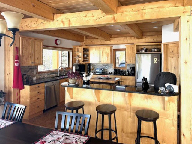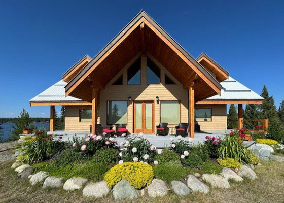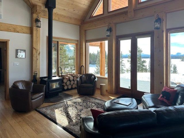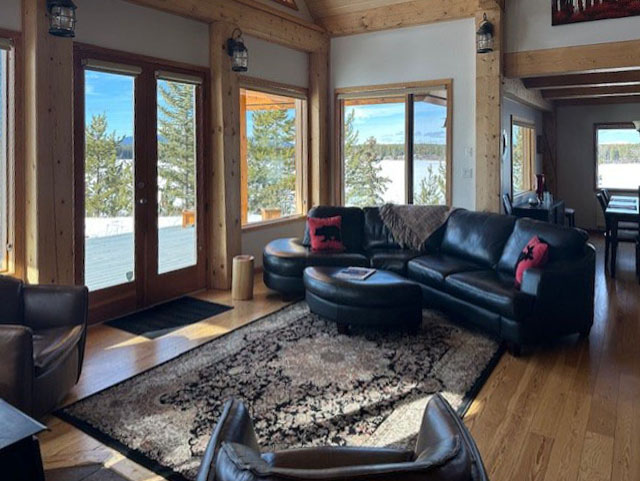 This exquisite 9.5-acre property on a southwestern facing peninsula on scenic Nimpo Lake includes 1,600 feet of lake frontage with 330 degrees of lake and mountain views from the two-storey post and beam home. The spacious great room features cathedral ceilings, floor-to-ceiling windows and an open concept interior.