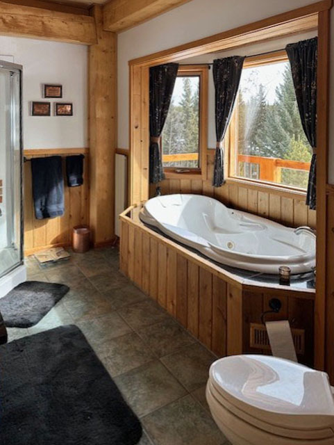 The kitchen has black granite counter tops, stone backsplash, birds eye maple solid wood cabinets, triple vessel sink and stainless-steel appliances. The sit-up bar separates the kitchen from the large dining room, once again with amazing lake and mountain views. The primary bedroom has a walk-in closet and ensuite bathroom with granite double vanity and glass shower showcasing the waterfront views from the granite surrounded jetted tub in the bay window. The main floor also provides a large laundry room and uniquely-designed powder room.