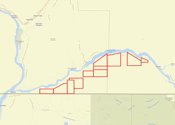 One of the most exclusive and private land portfolios in southern British Columbia. Bordered by the Pend d’Orielle River to the north and the United States to the south, this land holding spans 13.7 kilometres from east to west and covers an impressive 3,346.61 acres. The only access point to the property other than by water is across the BC Hydro’s Seven Mile Dam. Access across the dam is only for persons that own property on the south side of the dam, with secured electronic FAB key access to get through the gate and across the dam. This secured single access point makes this property one of British Columbia's most private wilderness sanctuaries. Although you are purchasing 3,346.61 deeded acres, the real opportunity exists with the access you gain to this landlocked chunk of BC's backcountry with approximately 12,538 acres to explore on the south side of the river. There is an incredible array of wildlife that remains undisturbed and call this area home, with giant wild turkeys, some of BC's largest elk, white-tailed deer, mule deer, bears and grouse.