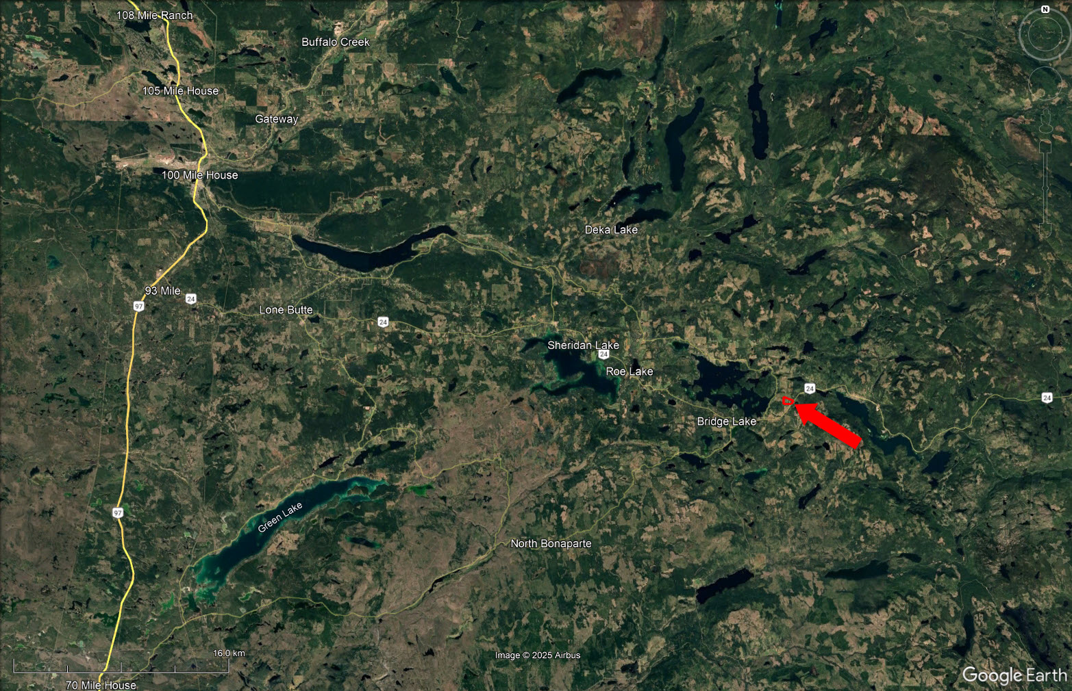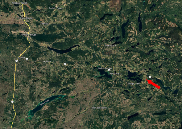 To the east of Bridge Lake on Highway 24 (“the Fishing Highway”)