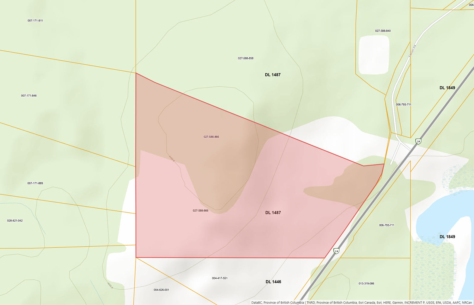 The land fronts on Highway 24 just east of Bridge Lake (3 km to a paved boat launch on Bridge Lake and 5 km to the Bridge Lake General Store). The land also has access off Falcon Road, a side road off Eagleridge Road providing a variety of access options. Power runs along the road. A driveway needs to be punched into the land through some forest. The ideal location for the driveway is at the end of Falcon Road, through the forest and then connecting to an internal road. This forest buffer along the highway and road also provides ample privacy.