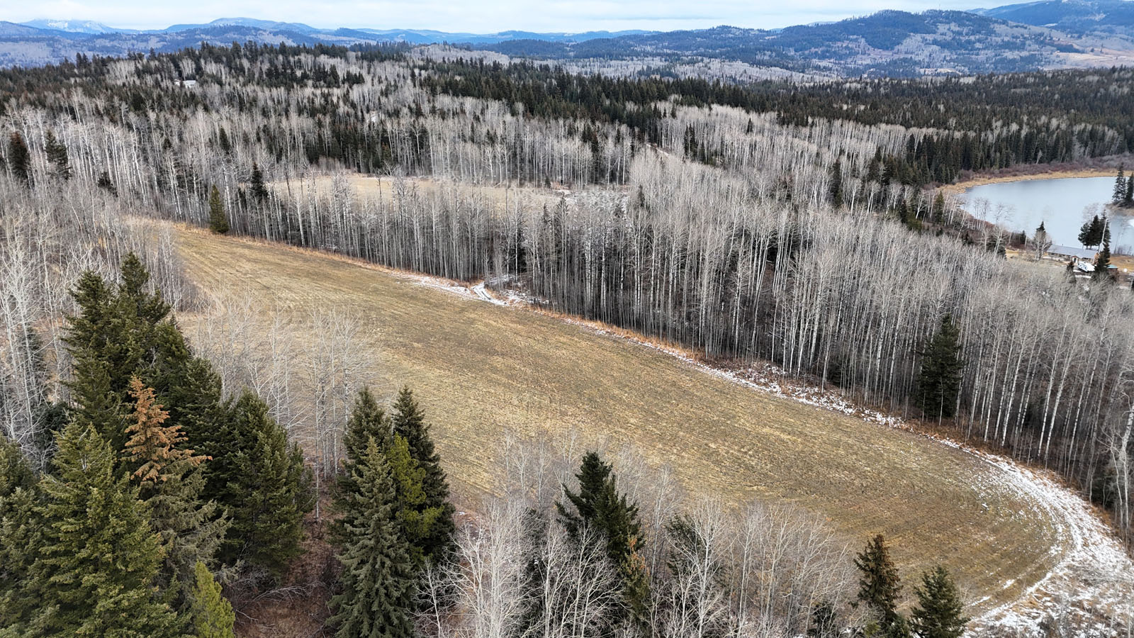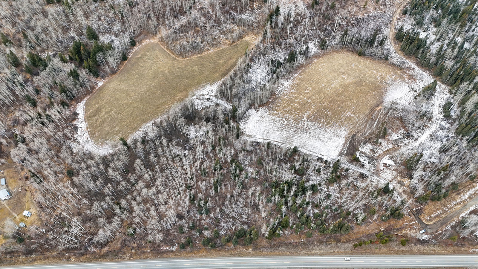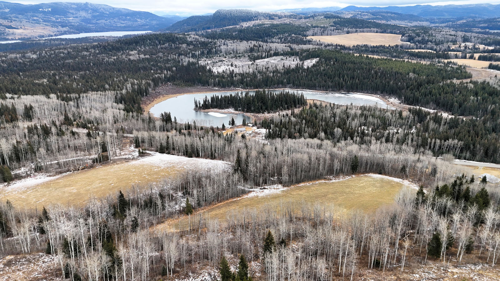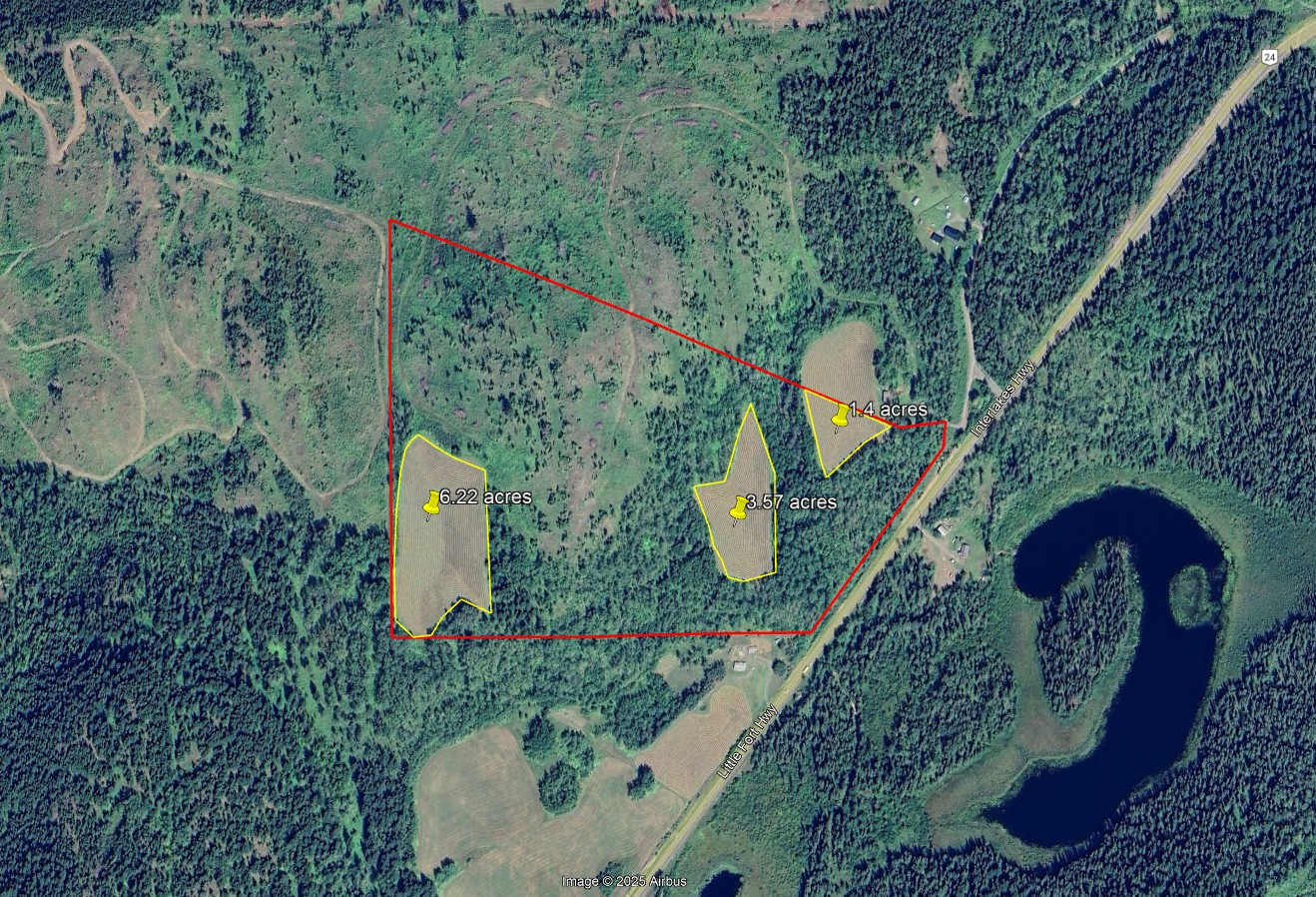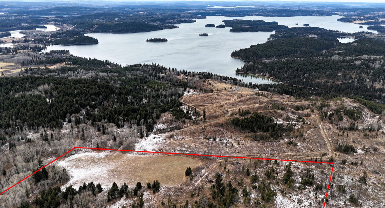 Quality view acreage overlooking Bridge Lake. This 66.47-acre property has 3 separate hay fields with 11+ acres of hay land. The hay fields are separated by a mixed forest, but an internal road connects the 3 fields.