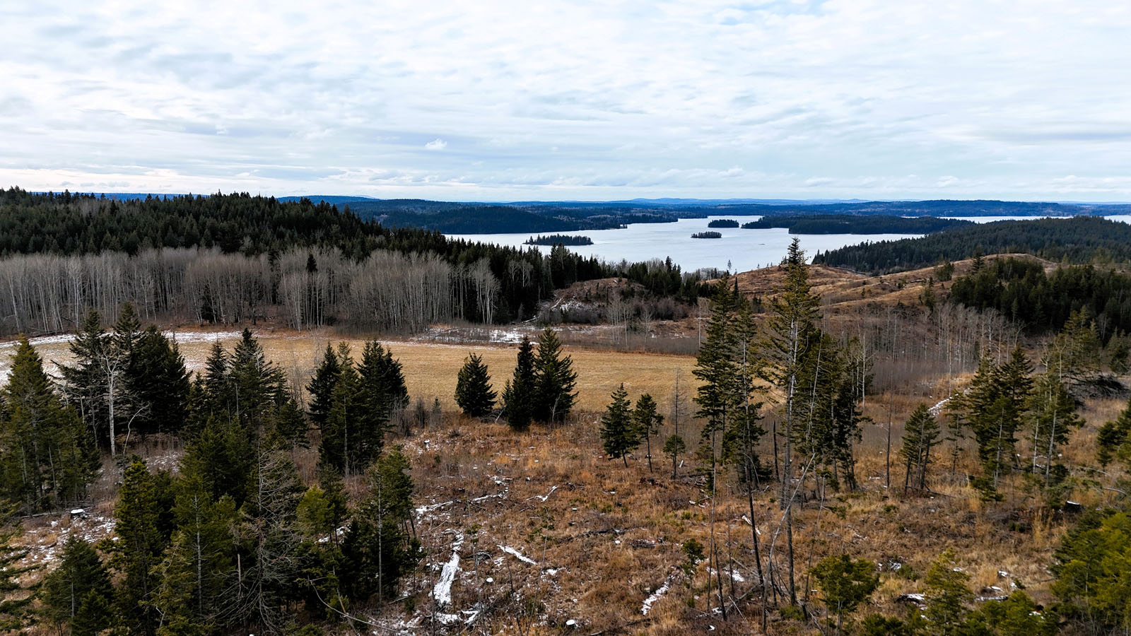 The land slopes away from the road, quite gradually at first then increasingly in pitch up to a central knoll and then drops down to the back side. All of the land is useable with good access throughout. From this central knoll down to the back side are expansive views of Bridge Lake, the views from the front side are not too shabby either!