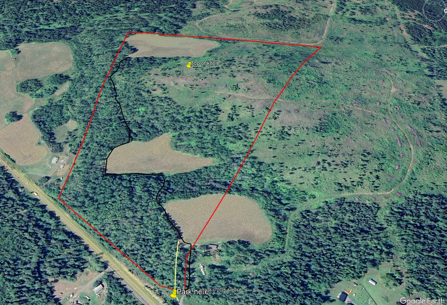 Access from the two front hay fields to the third hay field at the very back of the land is provided by an internal road that winds through forest. The front field is split with a neighbor (1.4 acres of hay on this land and about the same on the neighbors), while the other two fields (3.57 acres and 6.22 acres are private and entirely within the property). Please see maps and aerial photos.