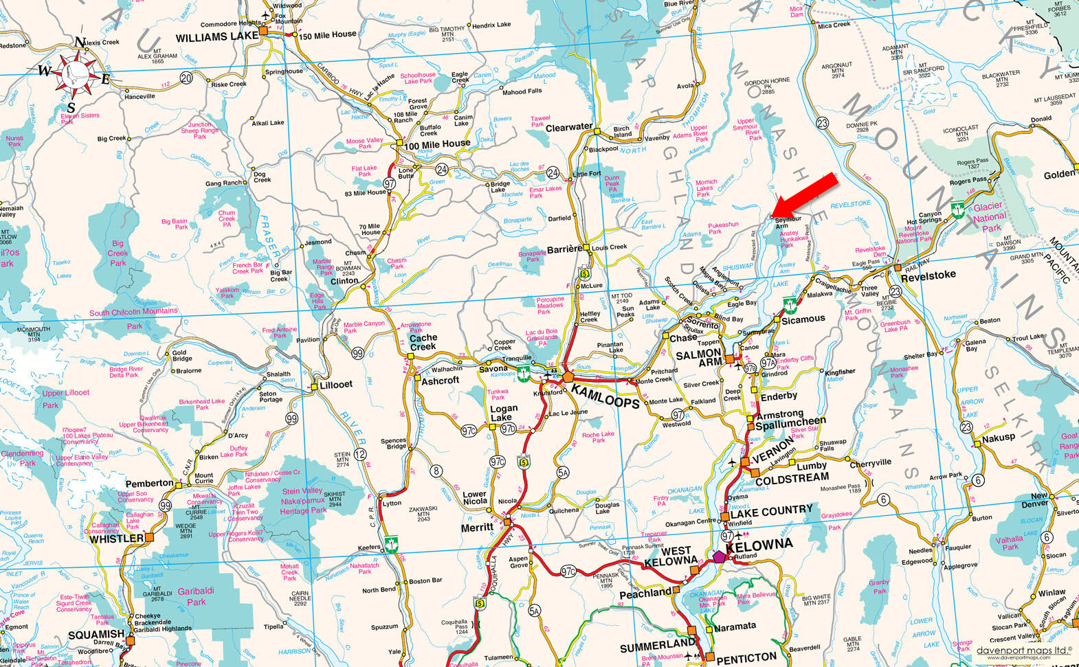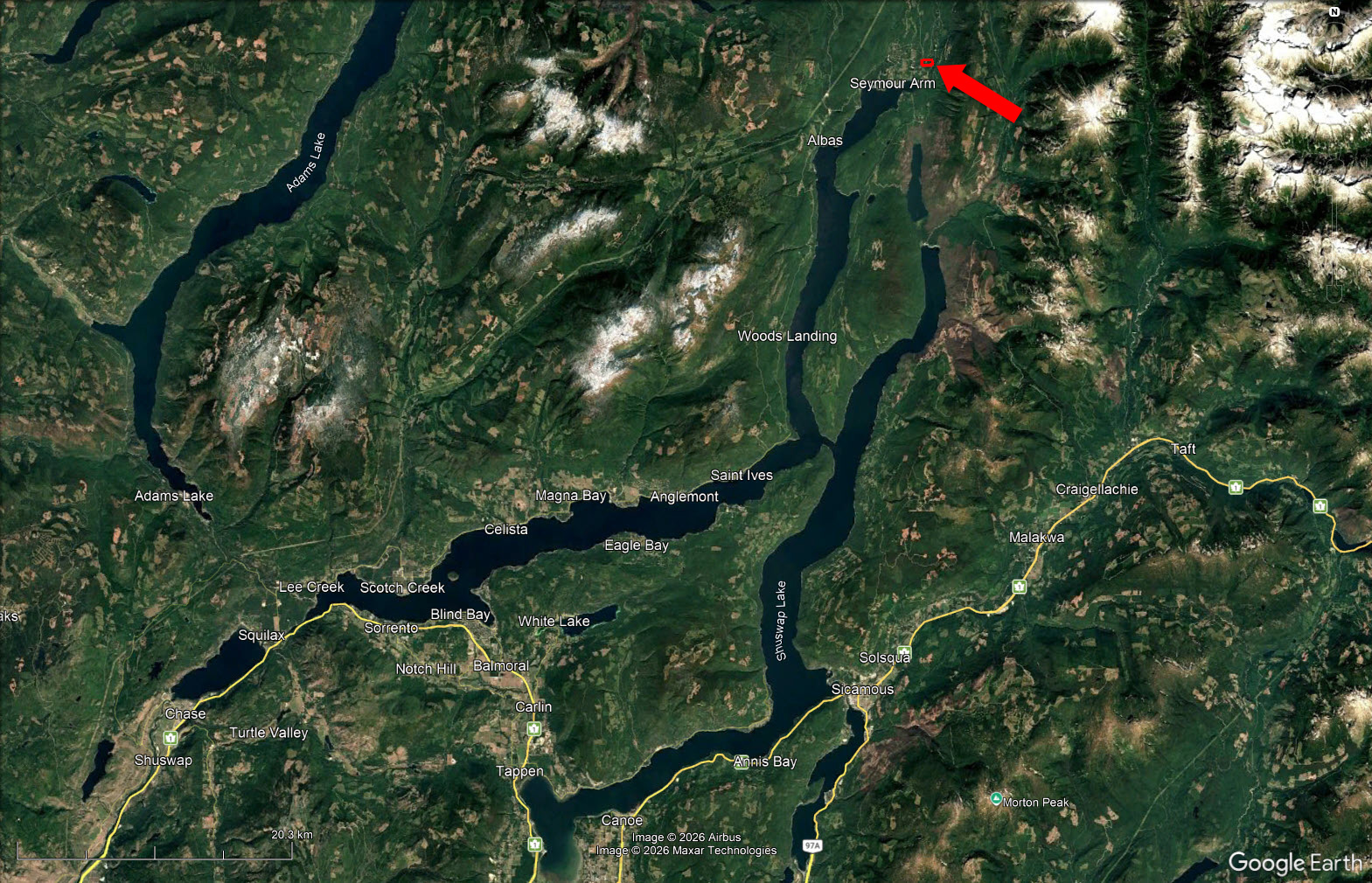 Seymour Arm is a small, lakeside community in the northern end of the Seymour Arm inlet of Shuswap Lake. It sits where the Seymour River meets the lake, surrounded by dense forest and mountain terrain typical of the Shuswap Highlands. The area is remote compared with most lakeside communities in the region, accessed by a long rural forest service road or by boat, which contributes to its quiet and secluded character.