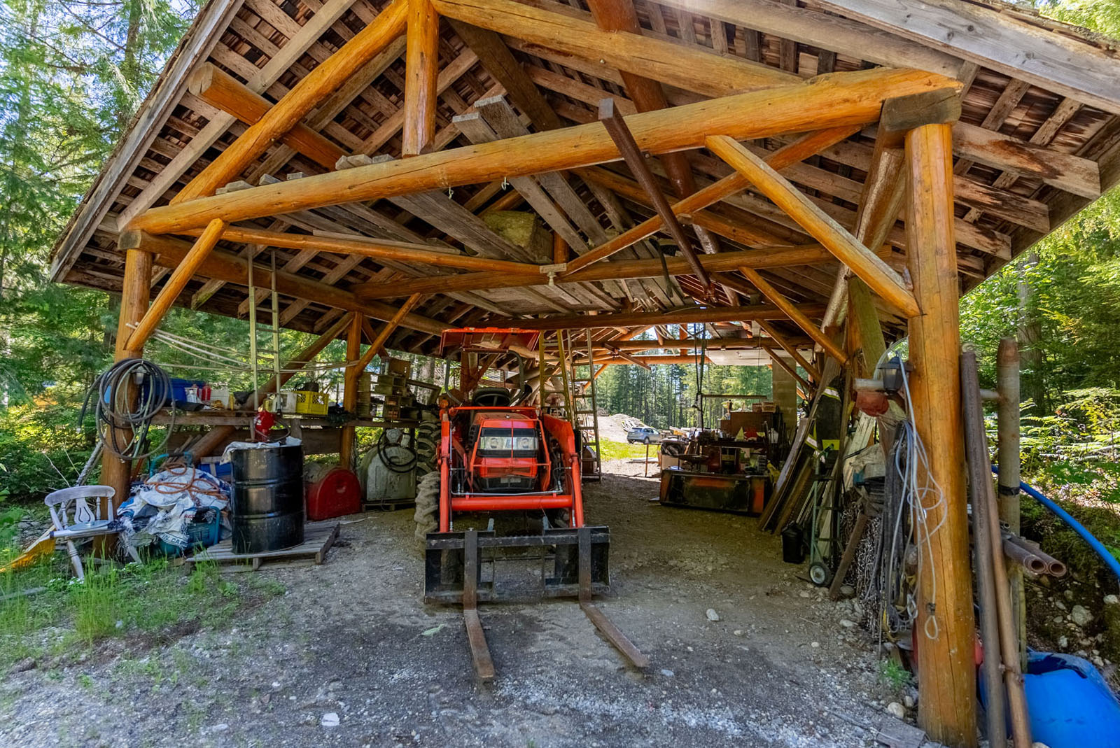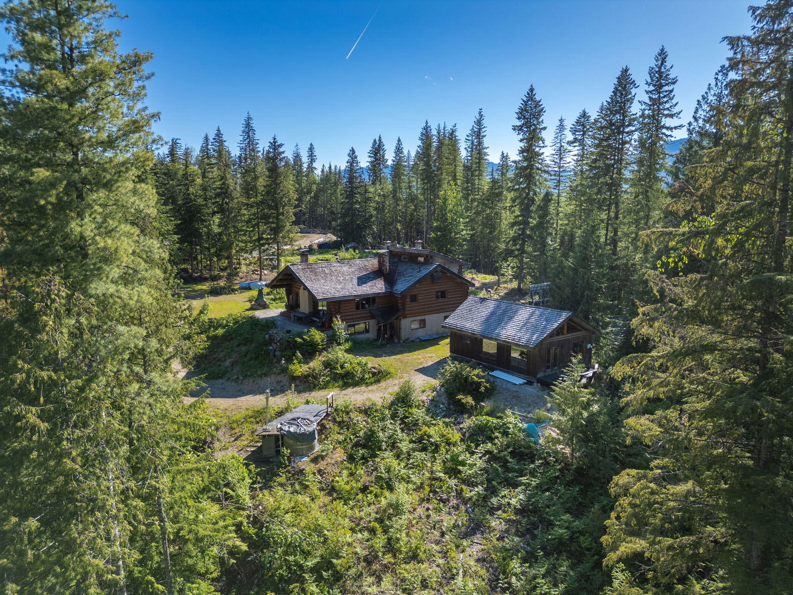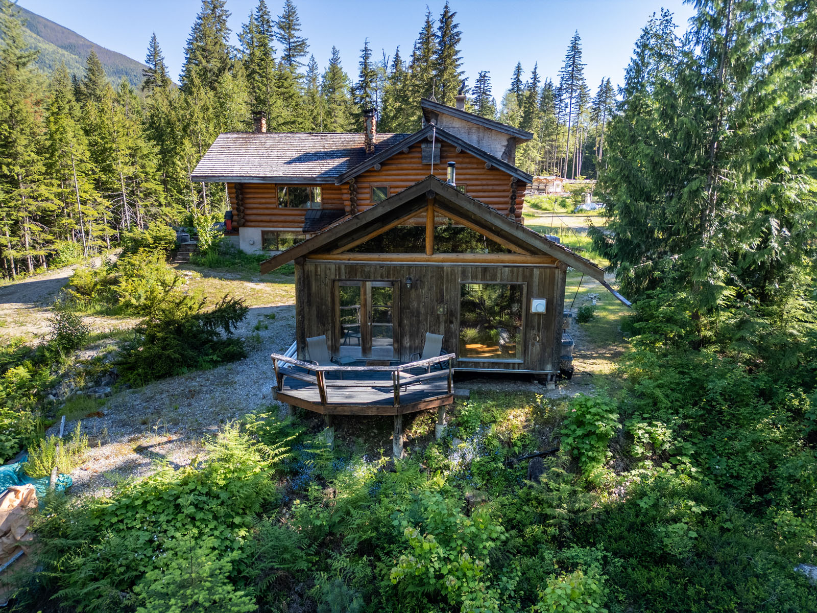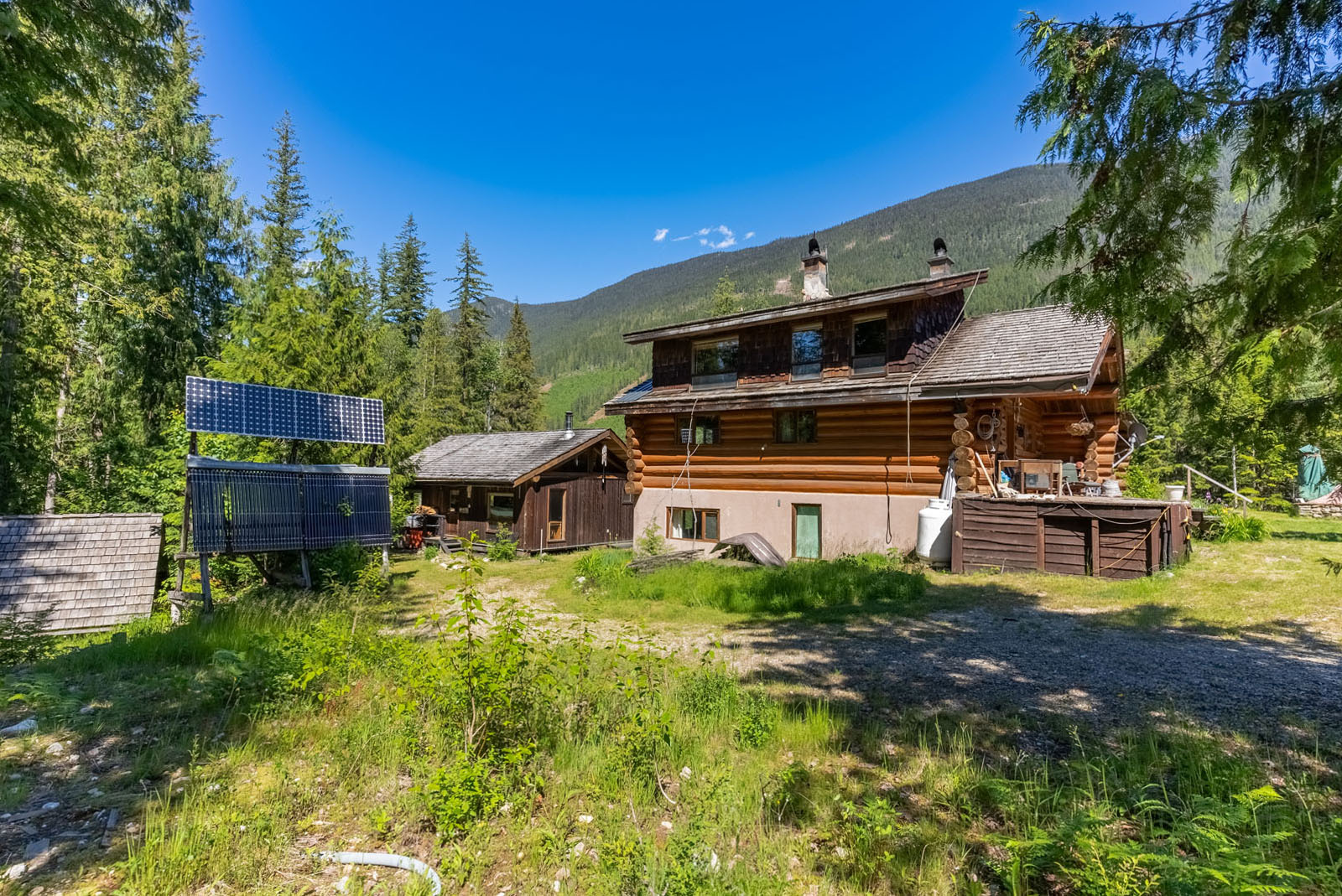 Rustic charm meets modern convenience in this self-sustaining getaway, fully serviced with off-grid power system, phone, Internet, and satellite TV. A gravity-fed water system sourced from a nearby creek and a combination of solar power and a Pelton wheel ensure reliable, off-grid living, free from utility bills and full of peace of mind. At the heart of the property sits a warm and inviting log home, complemented by a cozy riverside 25' x 35' guest cabin, greenhouse, a small unfinished creek side cabin and a variety of outbuildings—ideal for hosting large gatherings, group ownership, or creating a spa or wilderness resort. With breathtaking river views from the deck, every corner of the property invites rest, reflection, and connection to nature. Steward Creek also bisects the property on the east side of Seymour River, terminating in a wetland below the house and main infrastructure area.