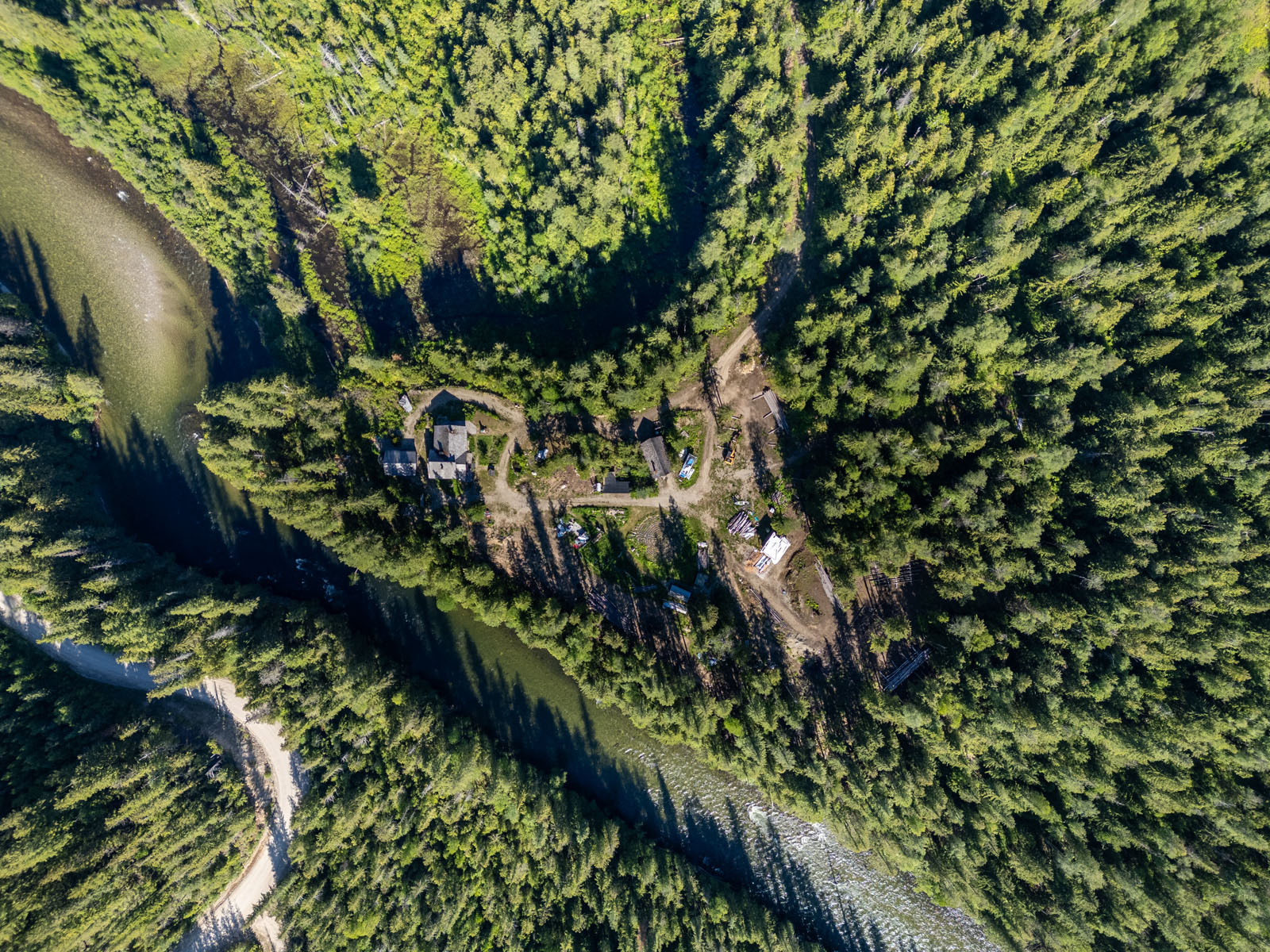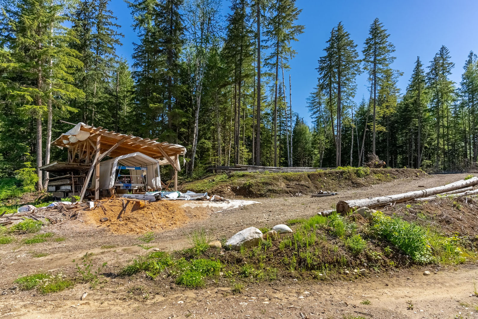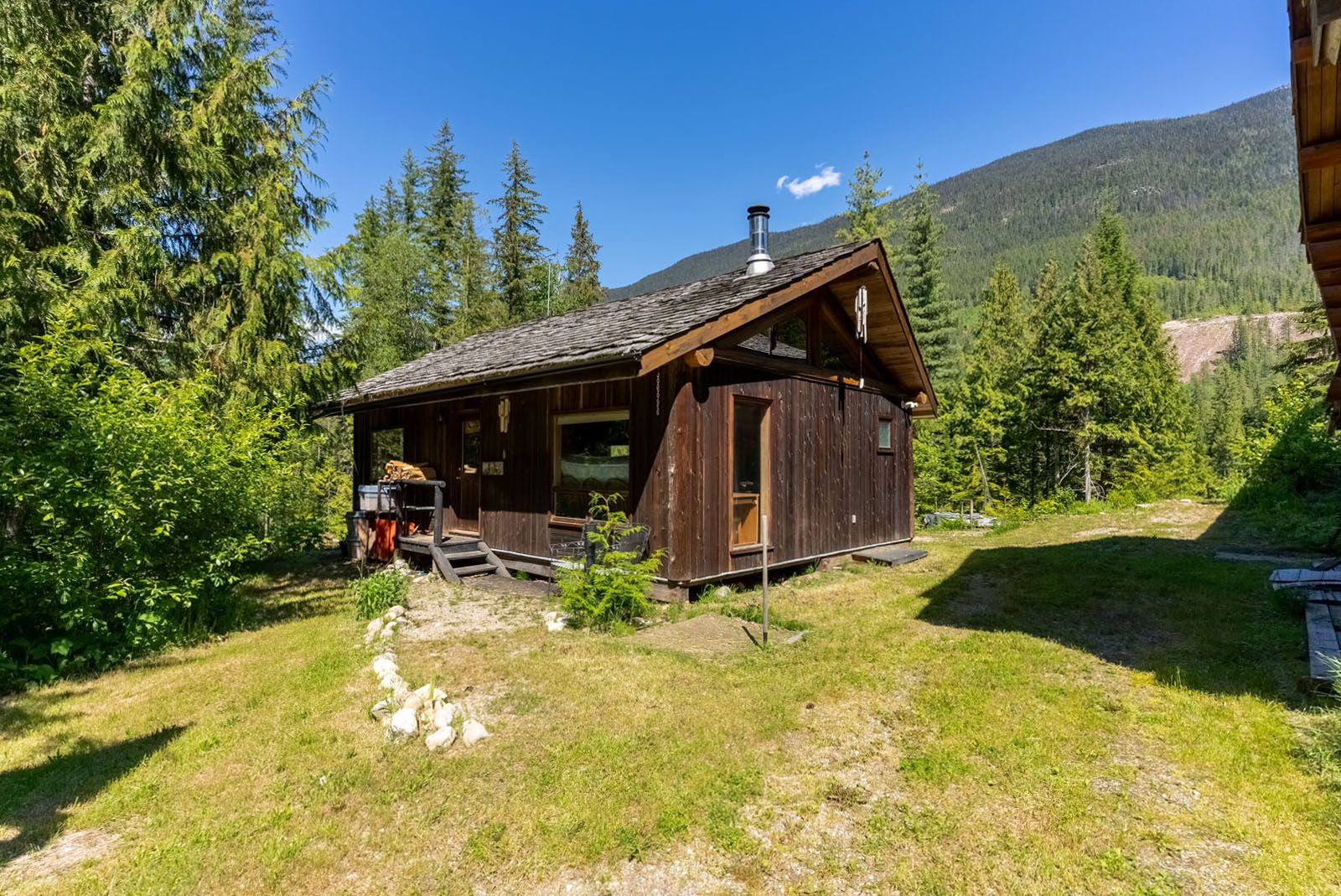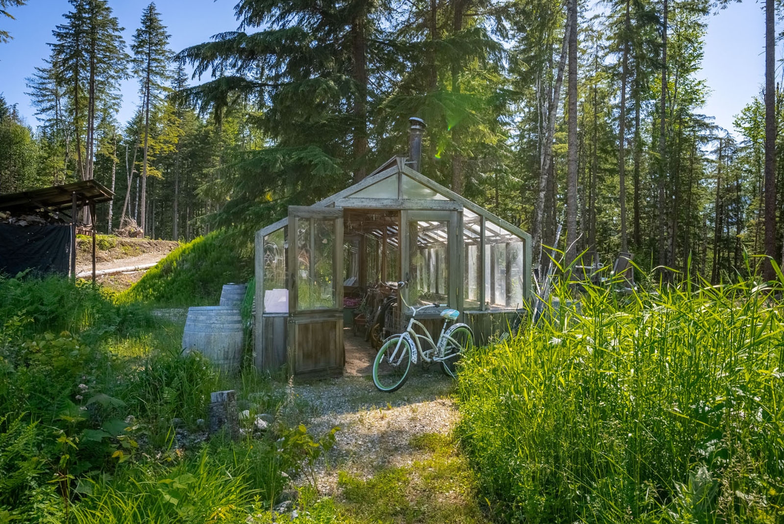 Rustic charm meets modern convenience in this self-sustaining getaway, fully serviced with off-grid power system, phone, Internet, and satellite TV. A gravity-fed water system sourced from a nearby creek and a combination of solar power and a Pelton wheel ensure reliable, off-grid living, free from utility bills and full of peace of mind. At the heart of the property sits a warm and inviting log home, complemented by a cozy riverside 25' x 35' guest cabin, greenhouse, a small unfinished creek side cabin and a variety of outbuildings—ideal for hosting large gatherings, group ownership, or creating a spa or wilderness resort. With breathtaking river views from the deck, every corner of the property invites rest, reflection, and connection to nature. Steward Creek also bisects the property on the east side of Seymour River, terminating in a wetland below the house and main infrastructure area.