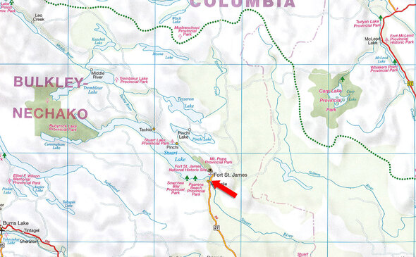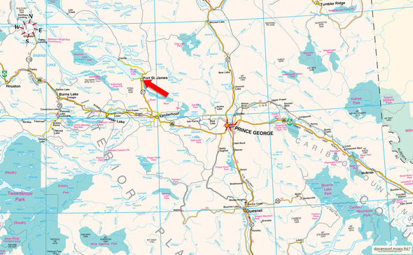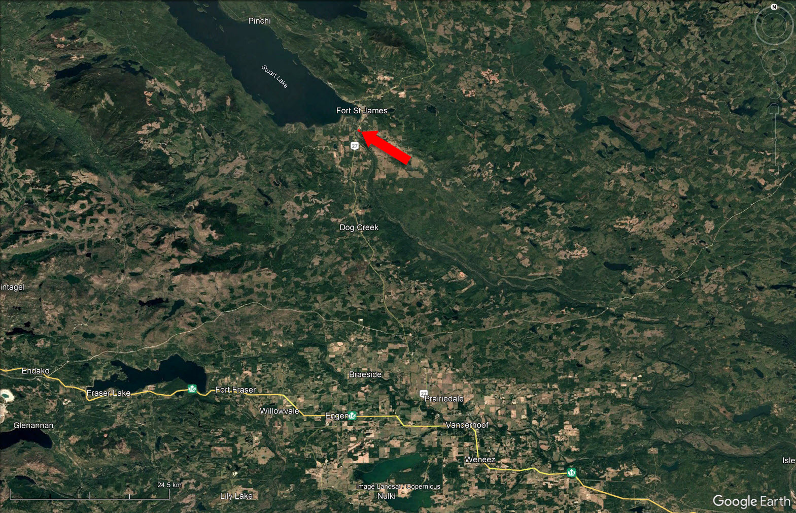 From Prince George, drive west on Highway 16 toward Vanderhoof, then turn north onto Highway 27 and continue toward Fort St. James. Follow Highway 27 into town, then turn onto Roberts Road and continue to 2880 Roberts Road. The total drive is approximately 200 kilometres and takes about two and a half hours, depending on road and weather conditions.