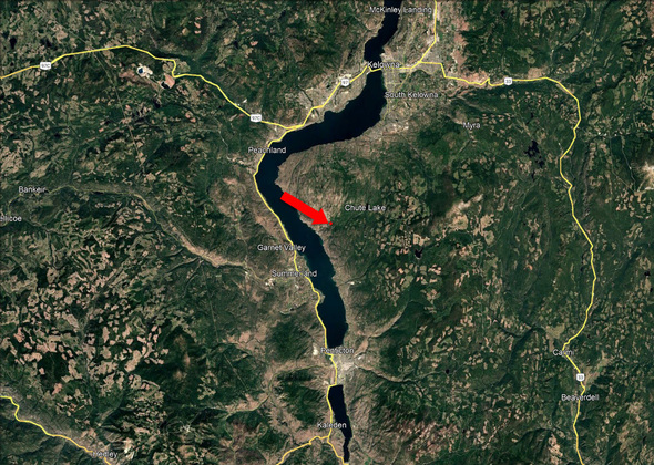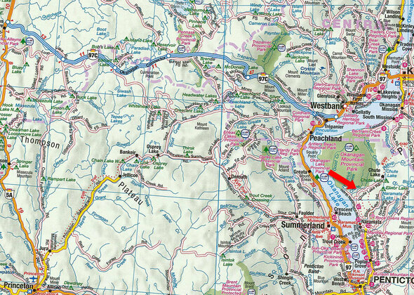 At the intersection of North Naramata Road and Chute Lake Road, turn right onto Chute Lake Road. Follow Chute Lake Road for 3 km, then turn left onto Glenfir Road. Turn right at the next intersection to continue up Glenfir Road. The driveway leads off the cul-de-sac and is the middle of three driveway access points.