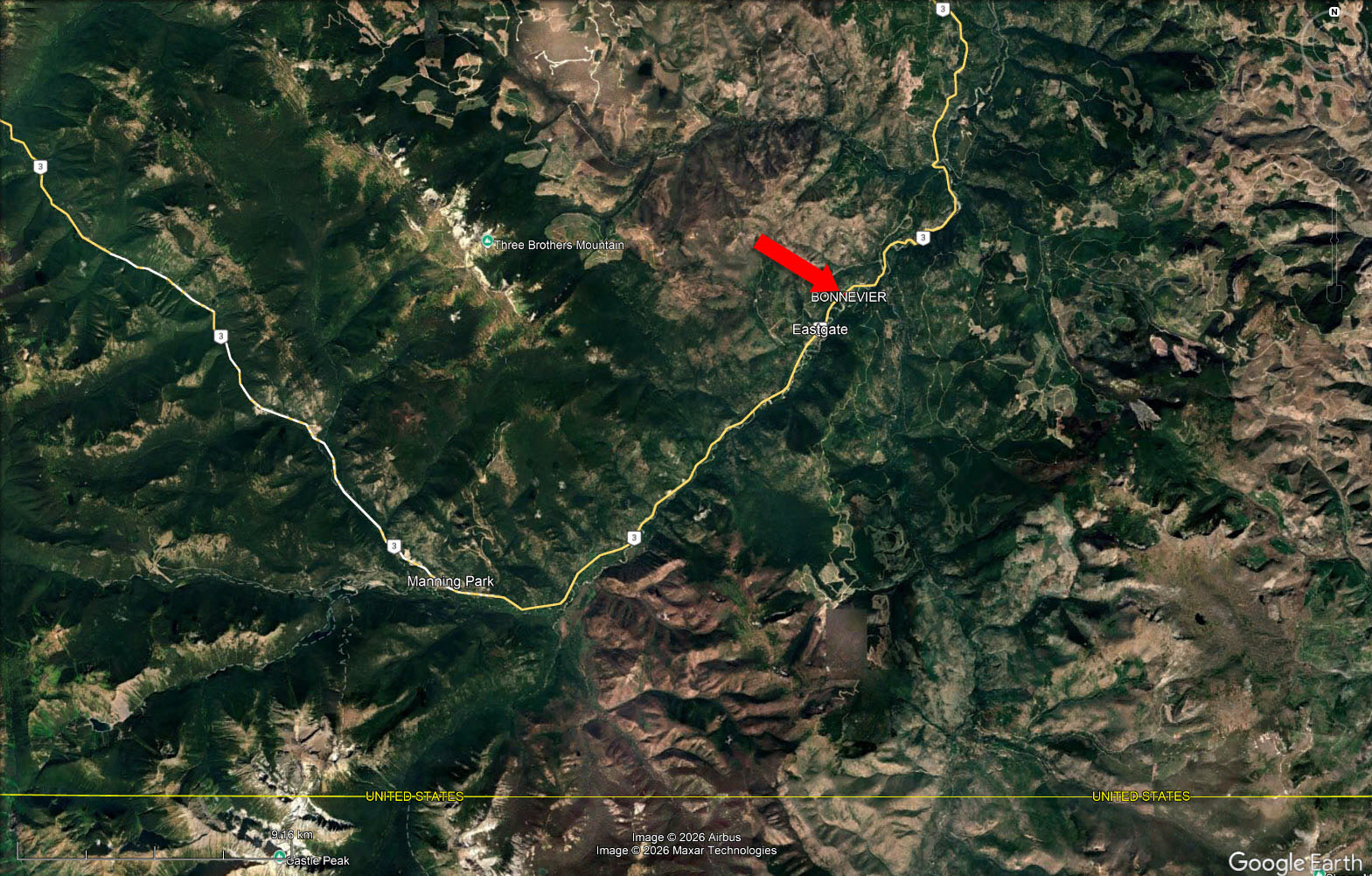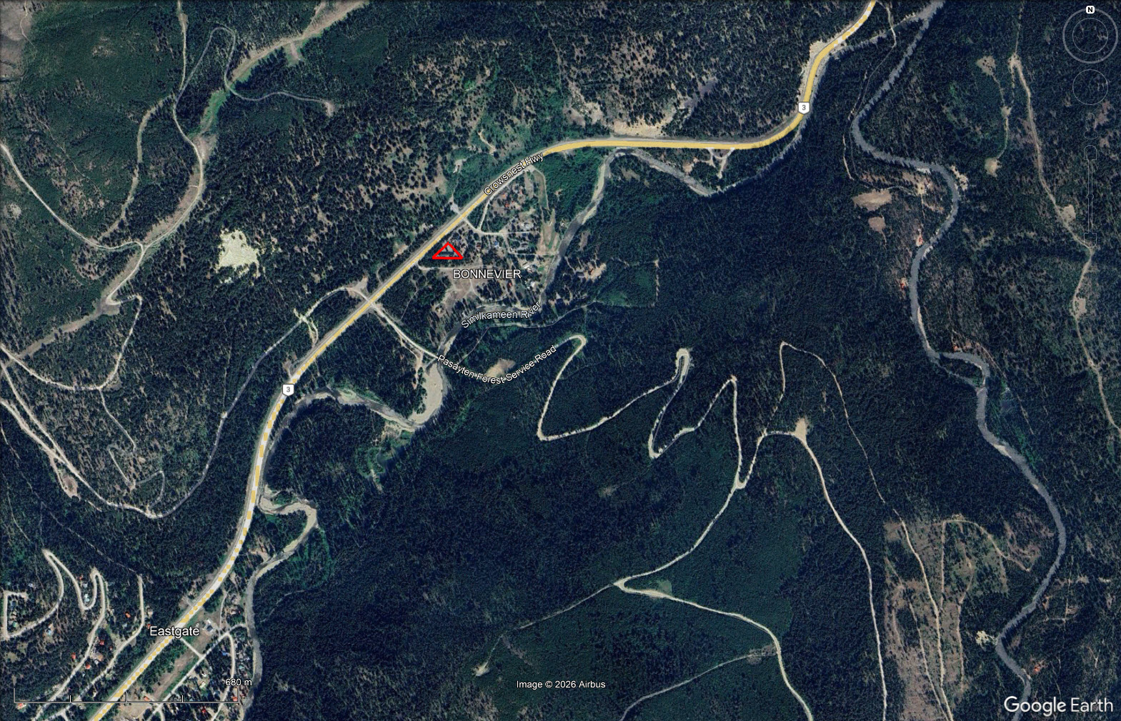 Direct snowmobile and ATV access leads from the parking area into the Pasayten Valley. The setting is surrounded by the Pasayten Wilderness Area and near the Similkameen River, approximately 3 hours from Vancouver and 2.5 hours from Kelowna. Highway 3 frontage provides year-round access and strong visibility for tourism use.