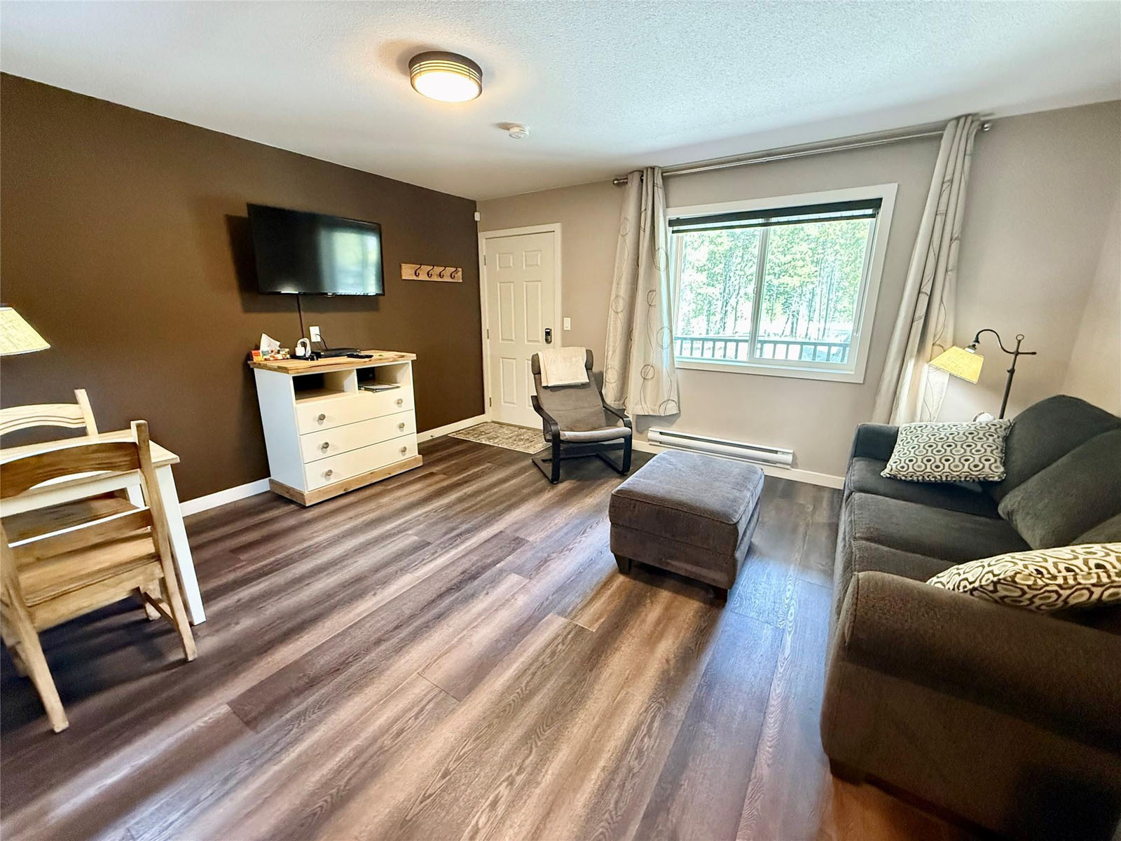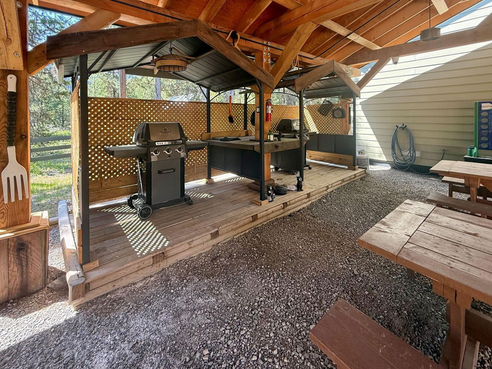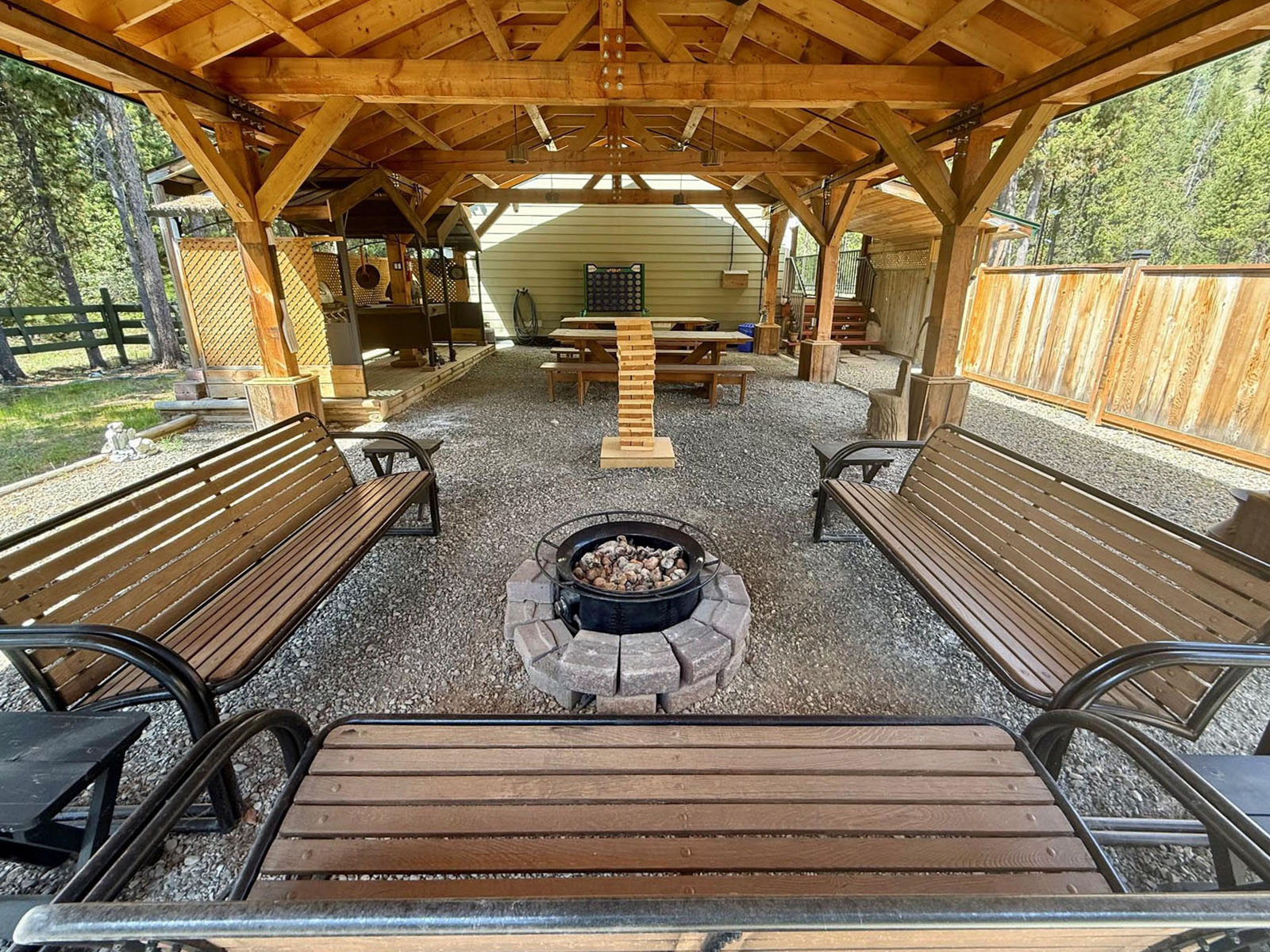 The lodge includes four self-contained 1-bedroom guest suites, each with queen bed, sofa bed, kitchenette (fridge and microwave), full bathroom with shower, Wi-Fi, and TV. The building is well insulated and soundproofed with fire-rated demising walls. Shared guest laundry and an additional fridge/storage area are on site, along with a covered outdoor BBQ and games area.