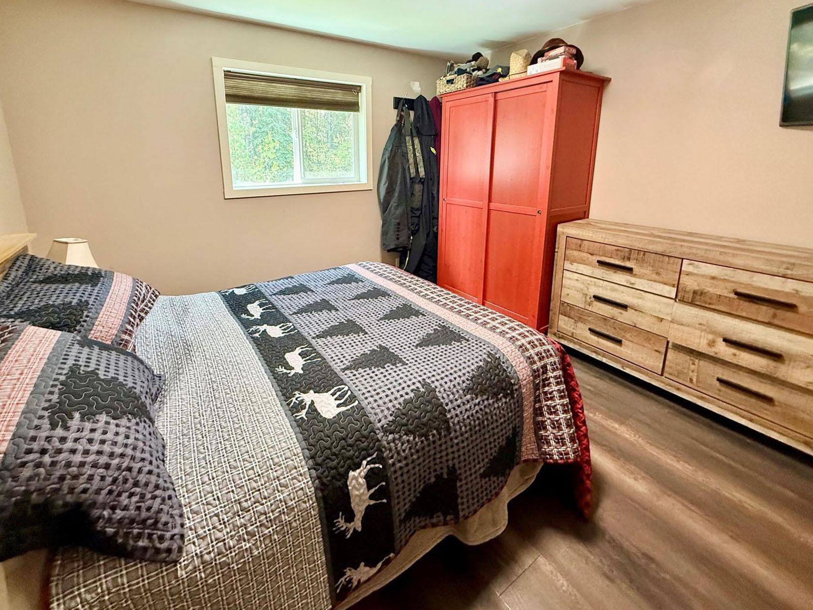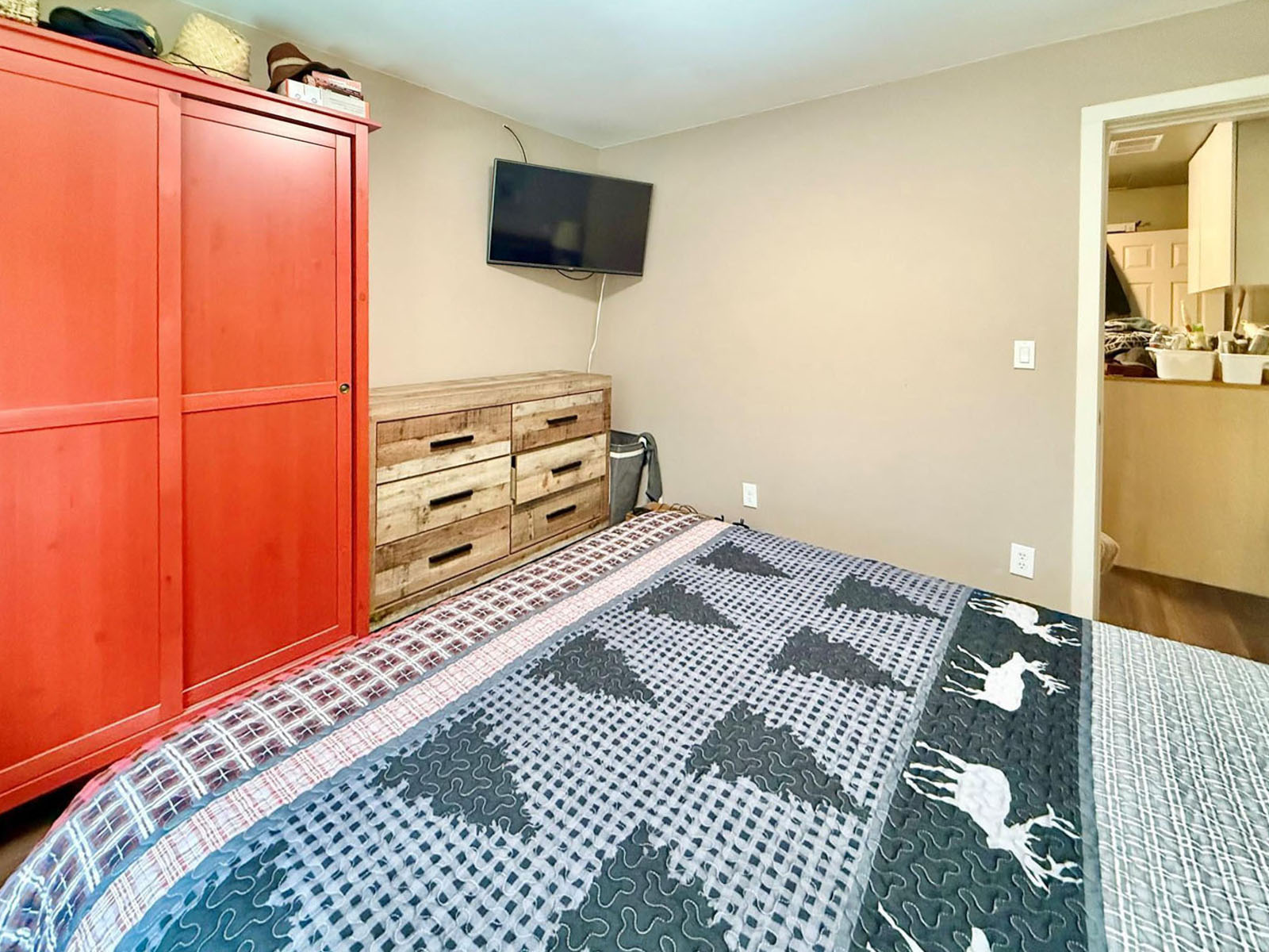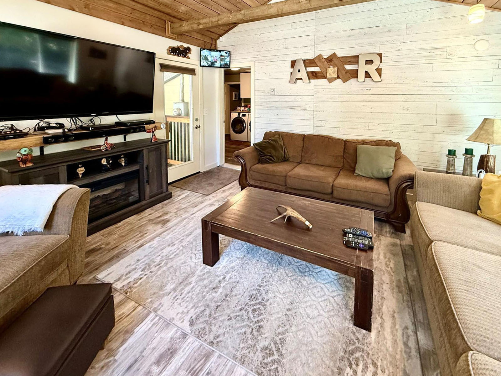 The lodge includes four self-contained 1-bedroom guest suites, each with queen bed, sofa bed, kitchenette (fridge and microwave), full bathroom with shower, Wi-Fi, and TV. The building is well insulated and soundproofed with fire-rated demising walls. Shared guest laundry and an additional fridge/storage area are on site, along with a covered outdoor BBQ and games area.