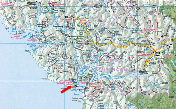 Nootka Island is a large island located on the remote and rugged west coast of Vancouver Island, enveloped by Nootka Sound, Nuchatlitz Inlet, Esperanza Inlet, Tahsis Inlet, and the Pacific Ocean.