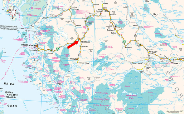 On this route, you’ll travel through scenic landscapes, including forests, mountains, and lakes. Along the way, you'll pass through towns such as Vanderhoof and Fraser Lake before reaching the city of Prince George, which is a major waypoint. From Prince George, continue driving north, following the highway and passing through remote areas with few services. As you approach the final stretch of your trip, the terrain becomes more rugged and you’ll get closer to the Skeena River, which is a notable landmark as you near Terrace.