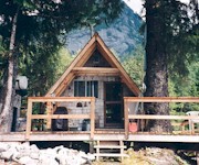 This immaculate, meticulously maintained cabin is perched on a little island in front of a beautiful waterfall in the most stunning setting imaginable. Mountains where you can watch mountain goats almost all the time surround the lake.